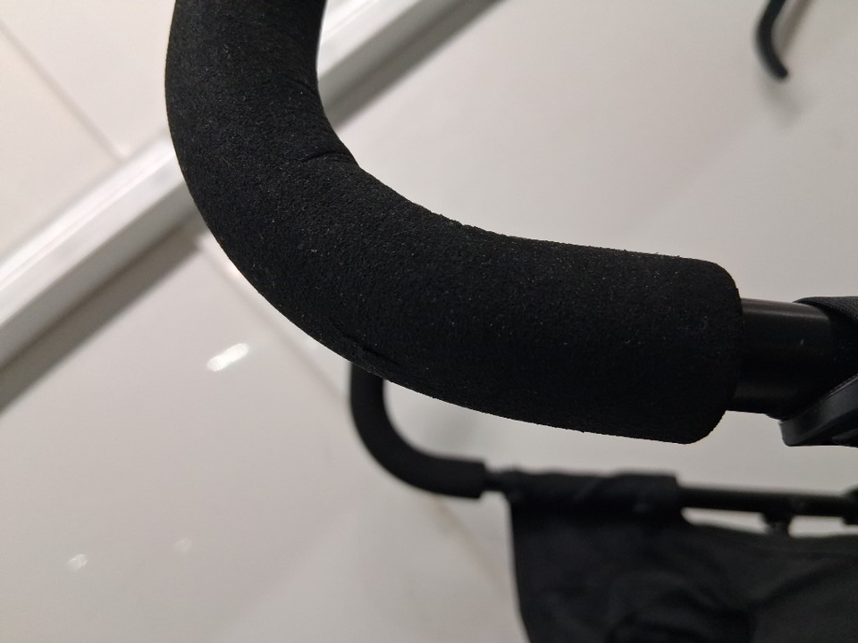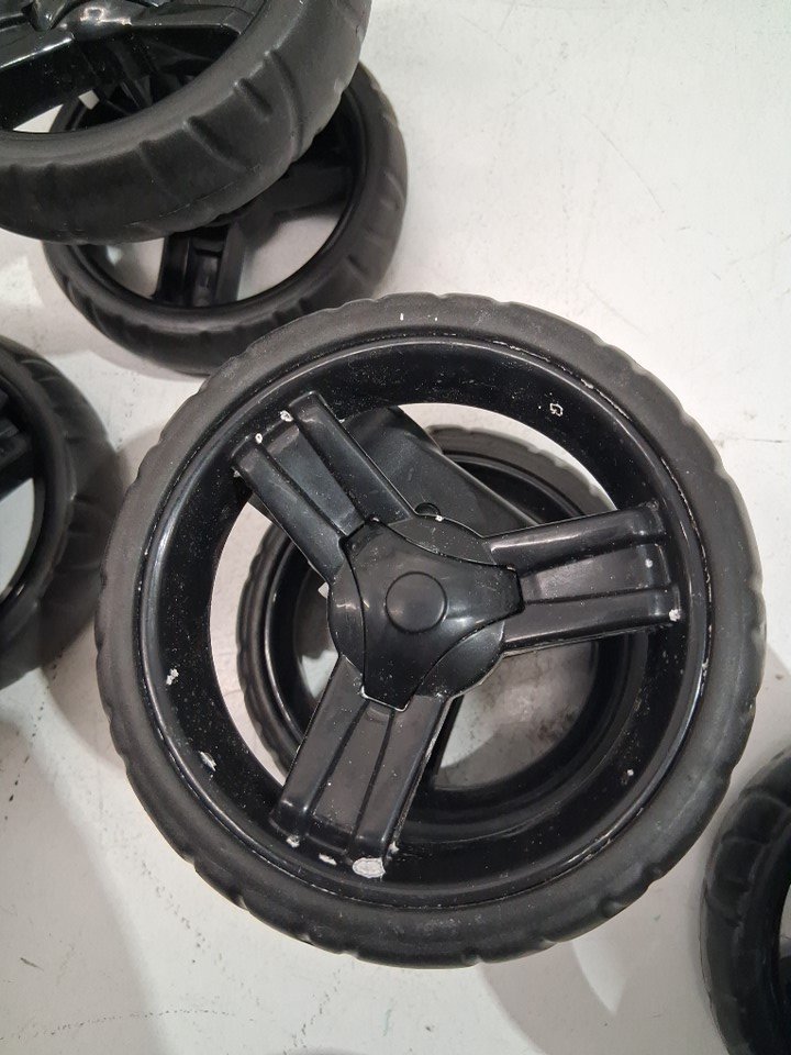 There is some water marks and light dirt staining on the wheels as well as a stain that was found inside the strollers inside fabric. the handles of this stroller are also quite distressed. also some light staining on the hood of retractable hood of the stroller.
