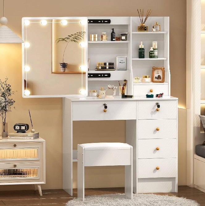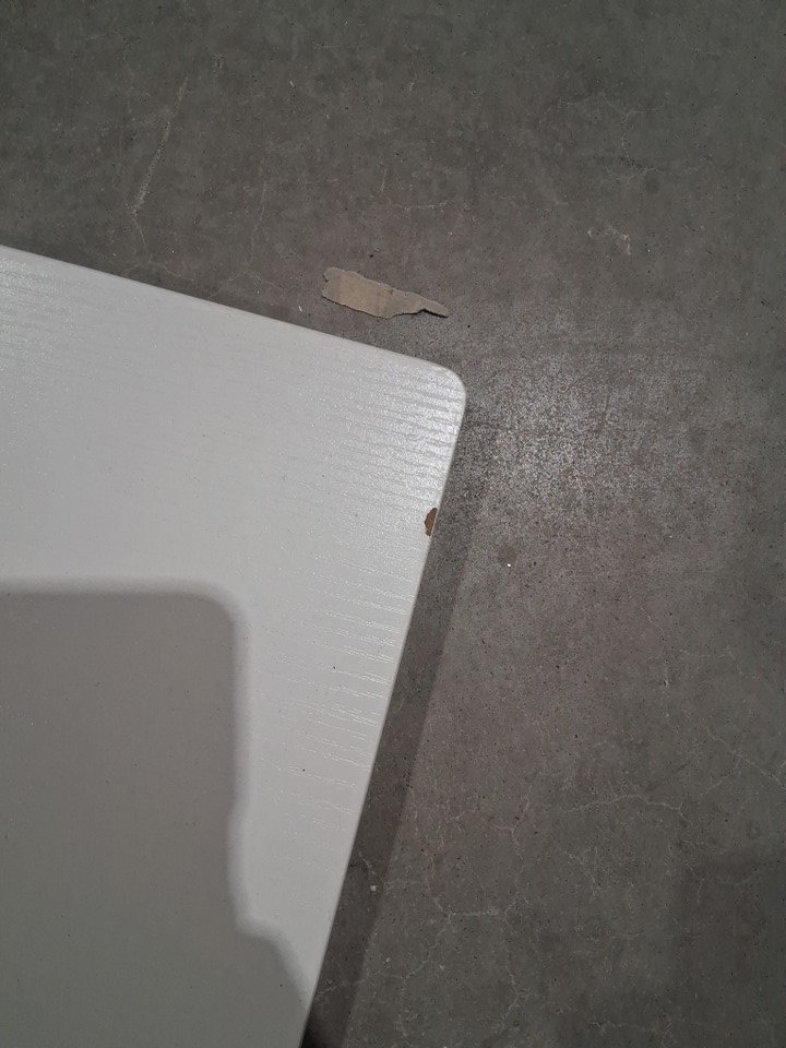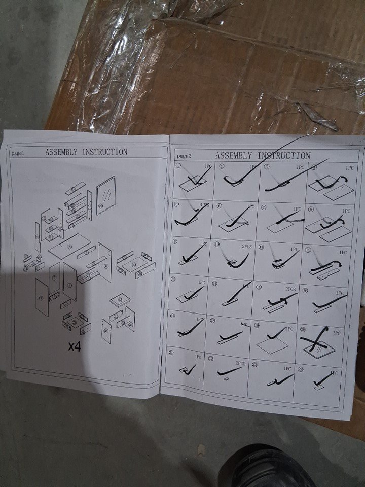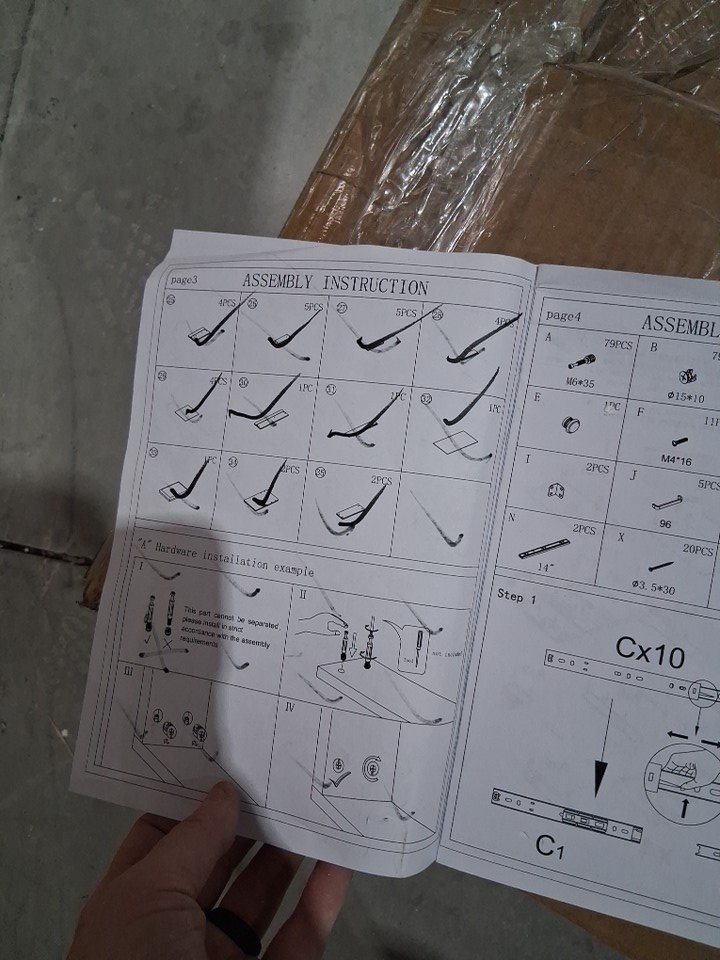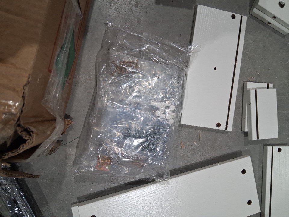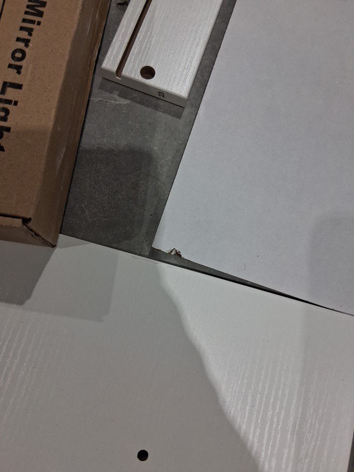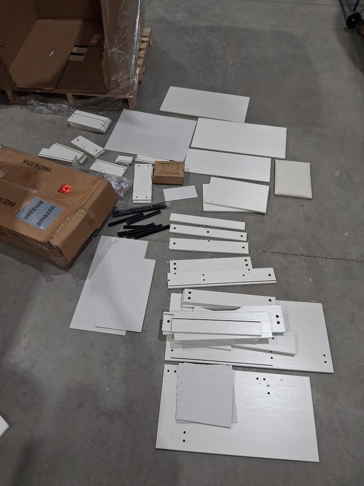 Mirror is missing from packaging, some paneling has dents and scuffs from shipping. All hardware is still sealed and pieces have been accounted for except for mirror