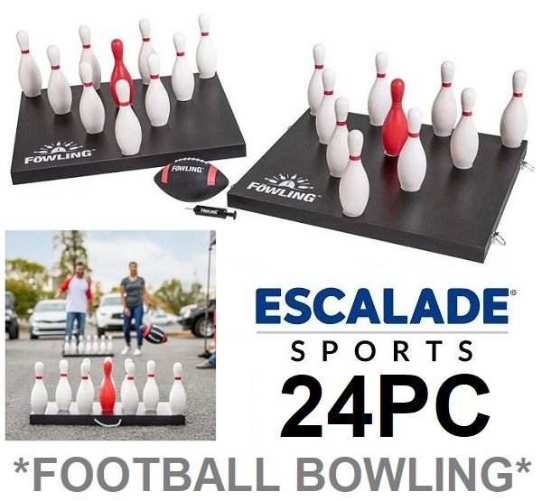 Set includes 18 white pins, 2 red pins, two boards, one football, and one air pump.