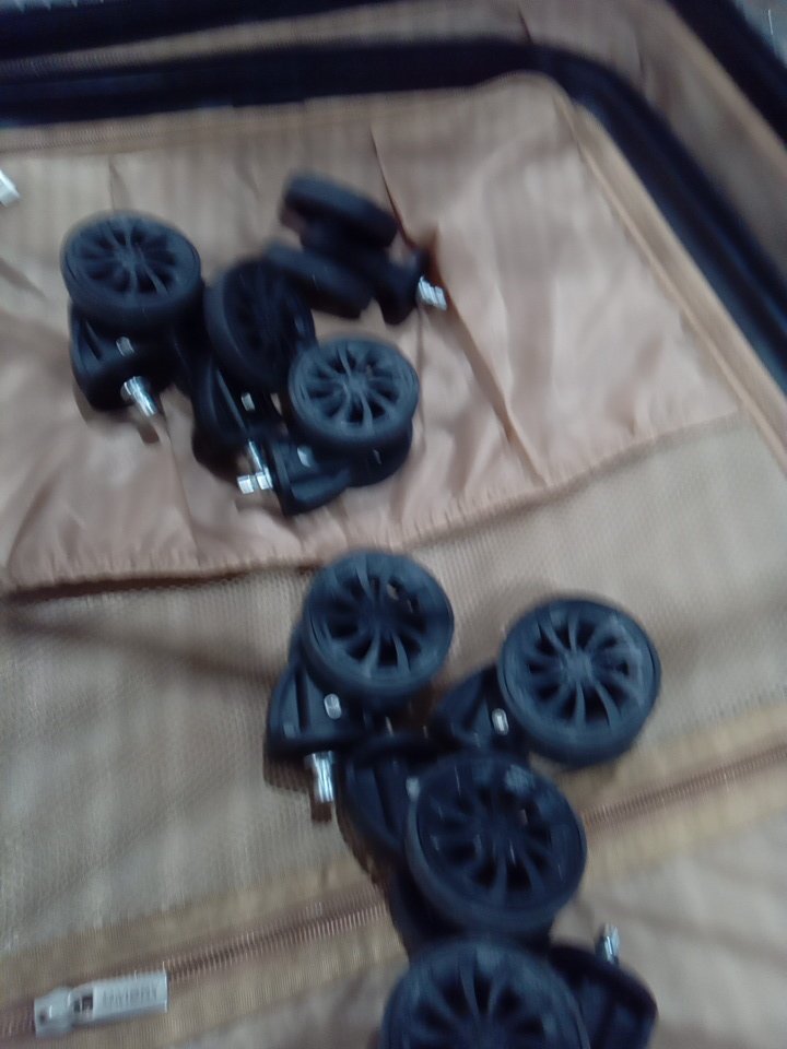 appears to have some scuffing were the wheels are. please note that all the wheels have been removed and put into smaller suitcase and 2 wheels are missing. there is some tread and scuff marks on the outside of the largest suit case (see photo)