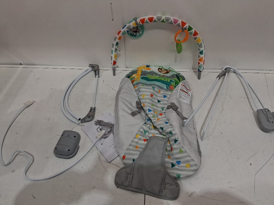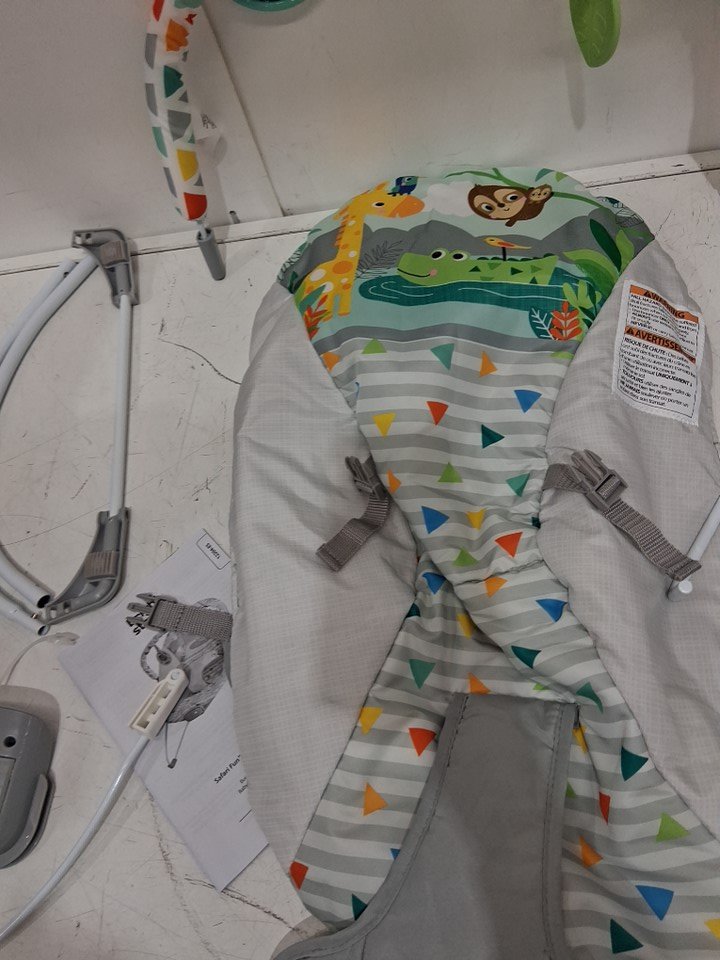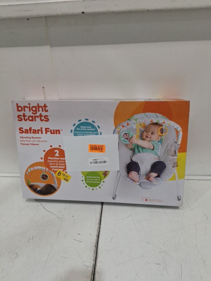 BRIGHT STARS 3 point harness VIBRATING BOUNCER WITH TOY BAR - safari fun
