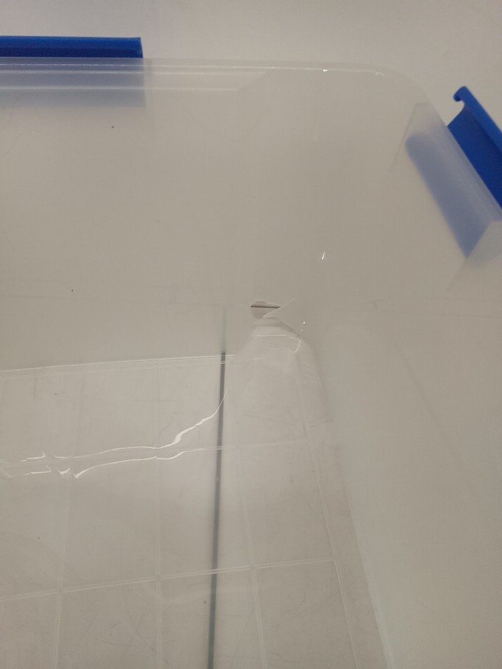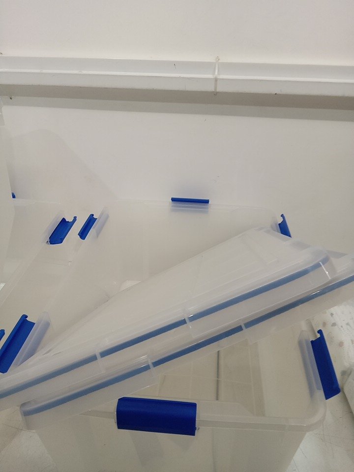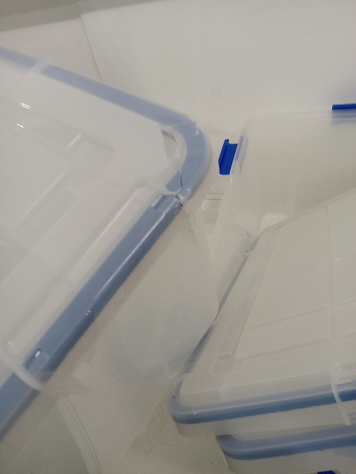 One bin is cracked. All lids are cracked. missing two clasps. Can likely still be used, lids would just need to be tapped closed.