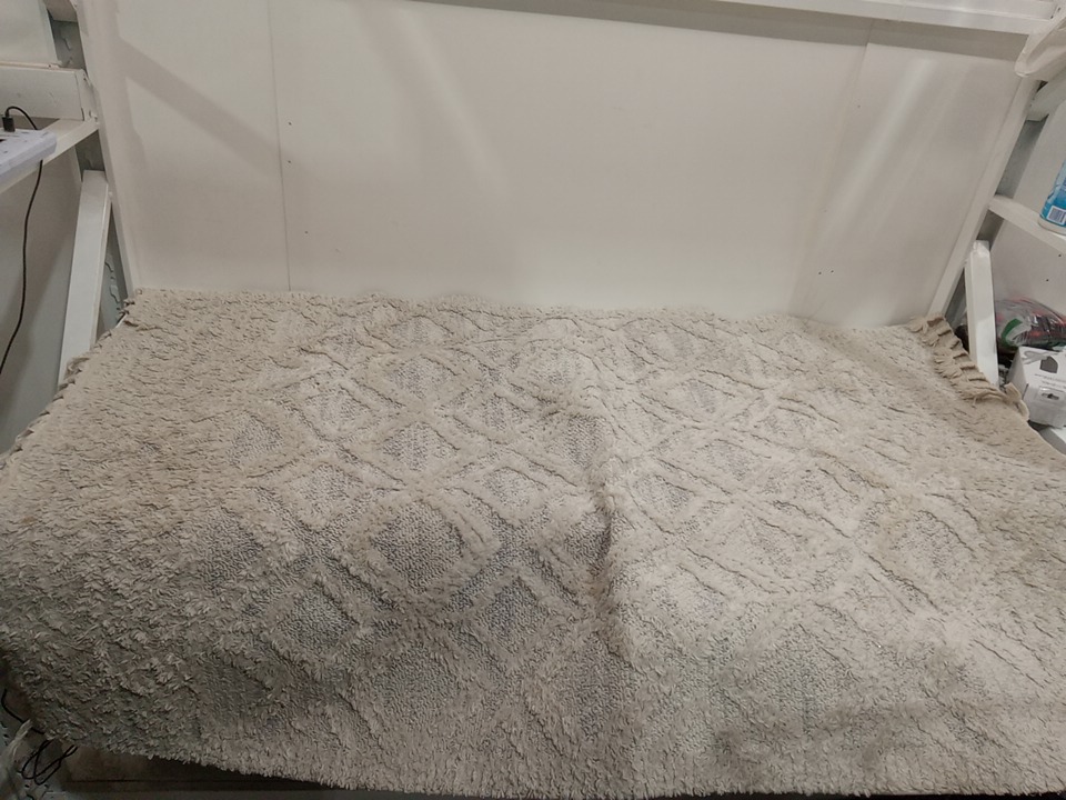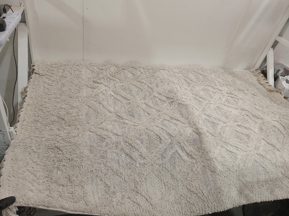 The rug has a distinct odor from previous use. and dirt spots around. we recommend a thorough wash before use. see photos
