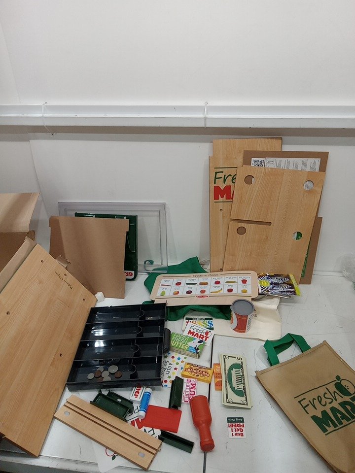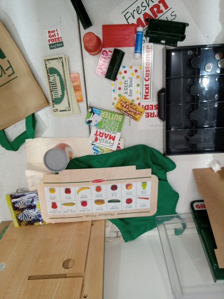 Missing some of the larger food items and likely some smaller ones. Some pieces of the counter set are included. Traces of glitter on it from previous use.