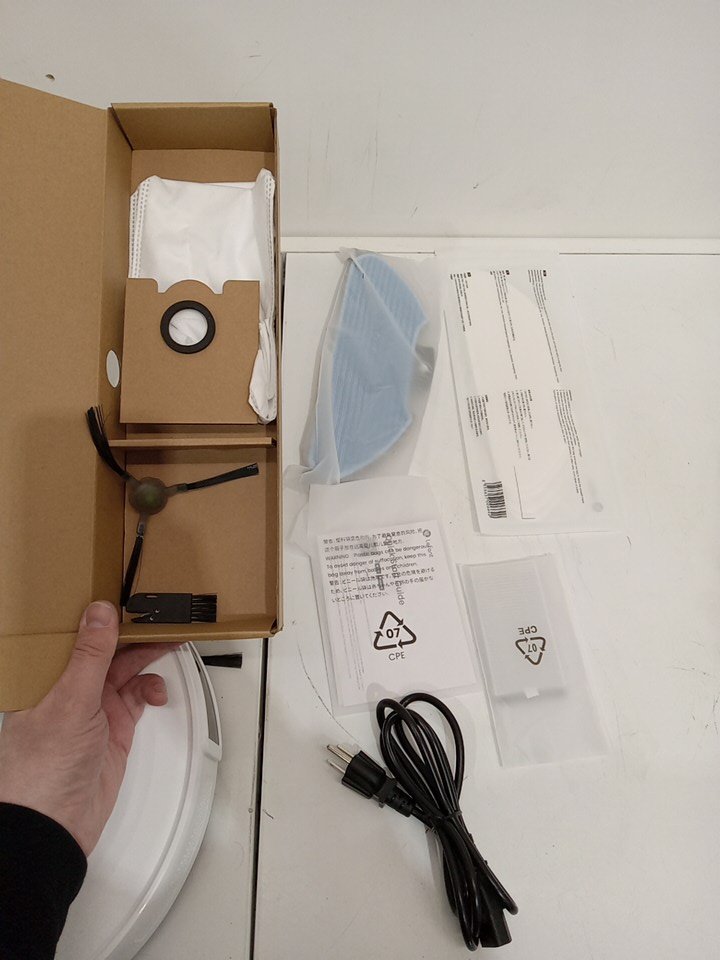 Item tested for power, charging, basic functionality and wifi/app connectivity. There is some minor dust/debris on both the robot vacuum and base station as a result from previous use. There is some light wear on the brush, the side brush and the mop pad attachment. There may be some minor scratches on the robot vacuum/base station. See attached photos.