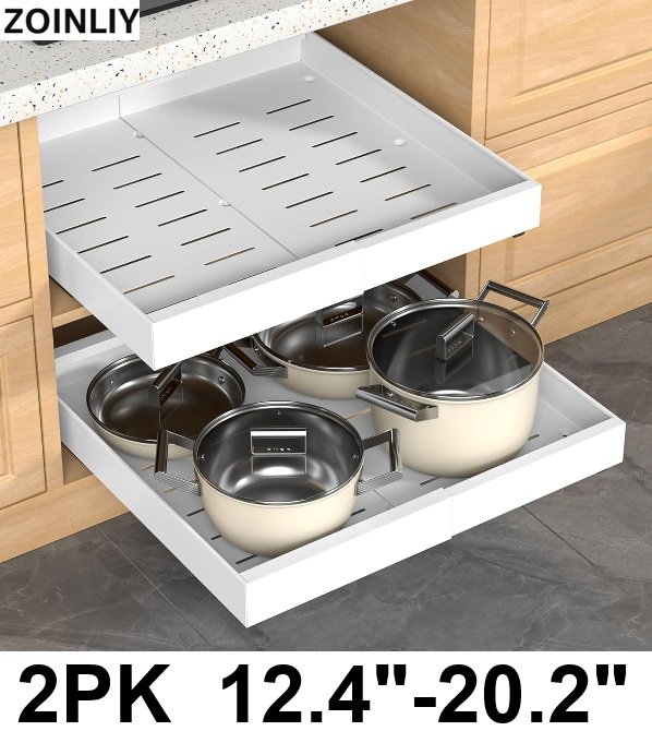 2pk ZOINLIY 21" deep Expandable Pull Out Metal Cabinet Organizer Drawer with Nano Adhesive-12.4"-20.2"-white (model: puo_2505)