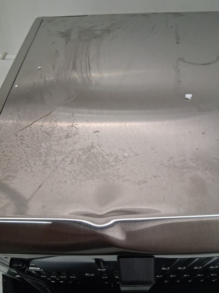 Item tested for power. Item has marks and scuffs from previous use. Also, it has dents from shipping as well. (See photos)