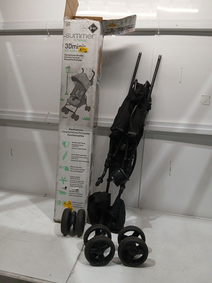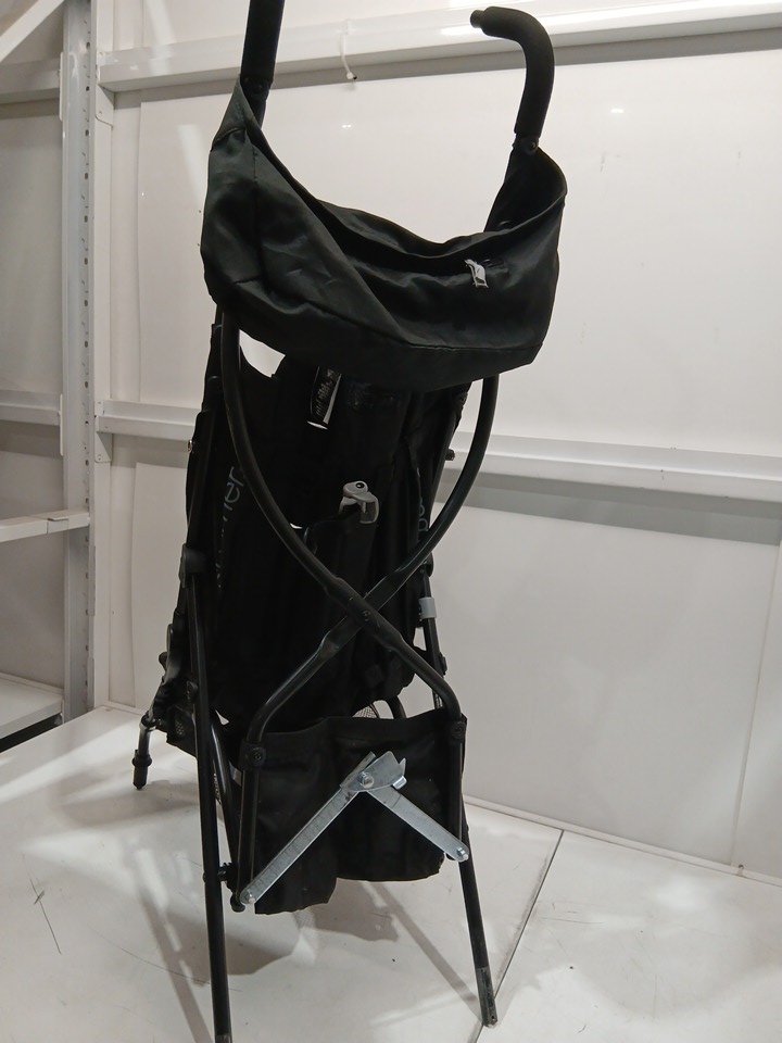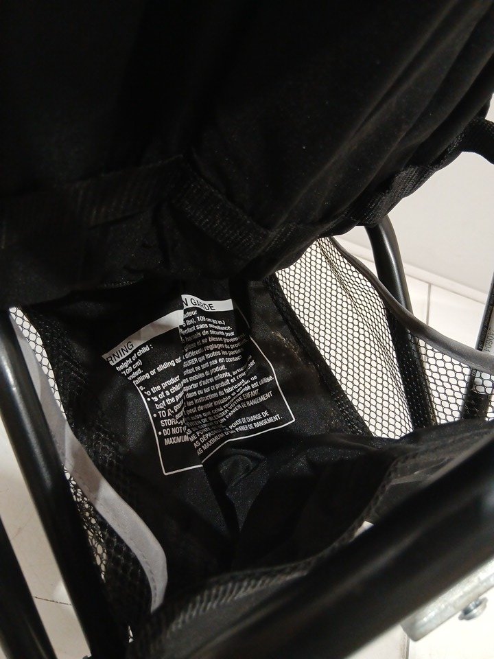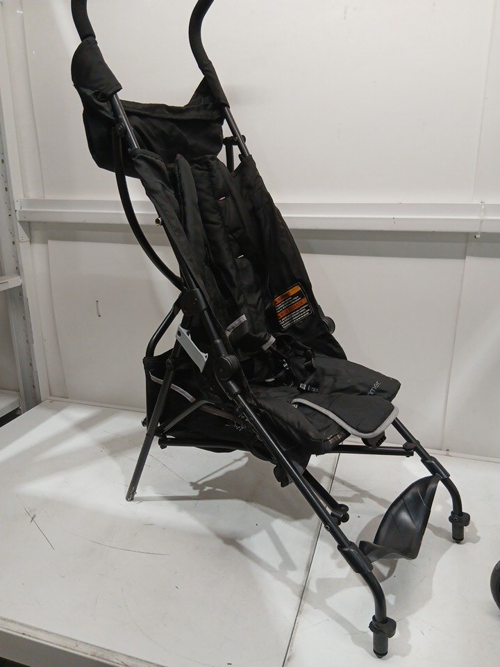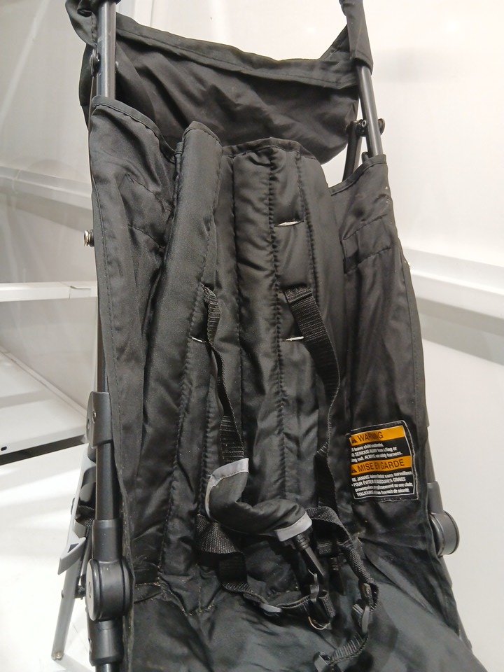 appears heavily used due to amount of wear on wheels (minimal tread left), dirt and scratches on upholstery, and scratches on metal. also contains a musty/outdoor smell coming from the fabric.