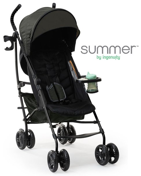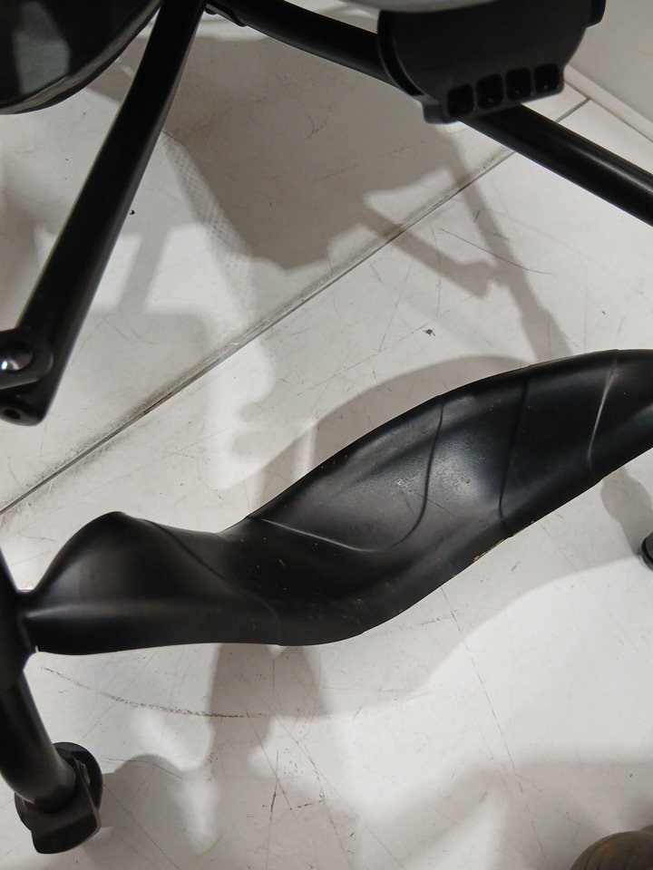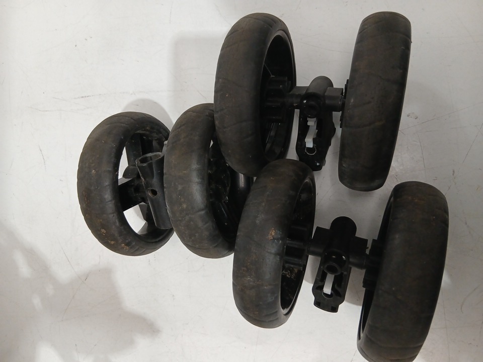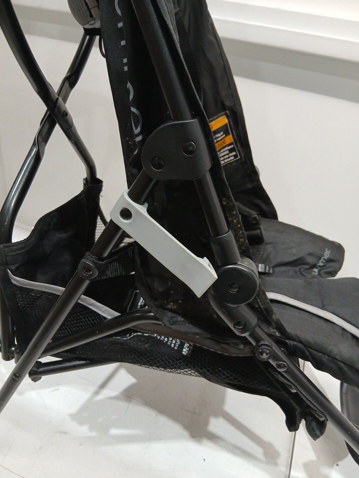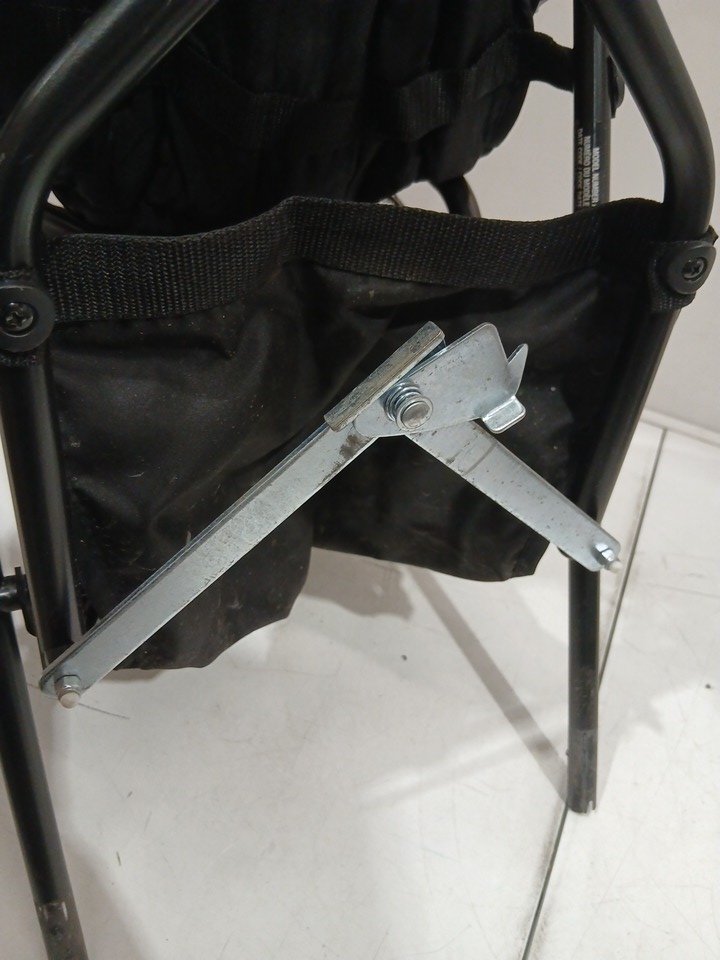 appears heavily used due to amount of wear on wheels (minimal tread left), dirt and scratches on upholstery, and scratches on metal. also contains a musty/outdoor smell coming from the fabric.