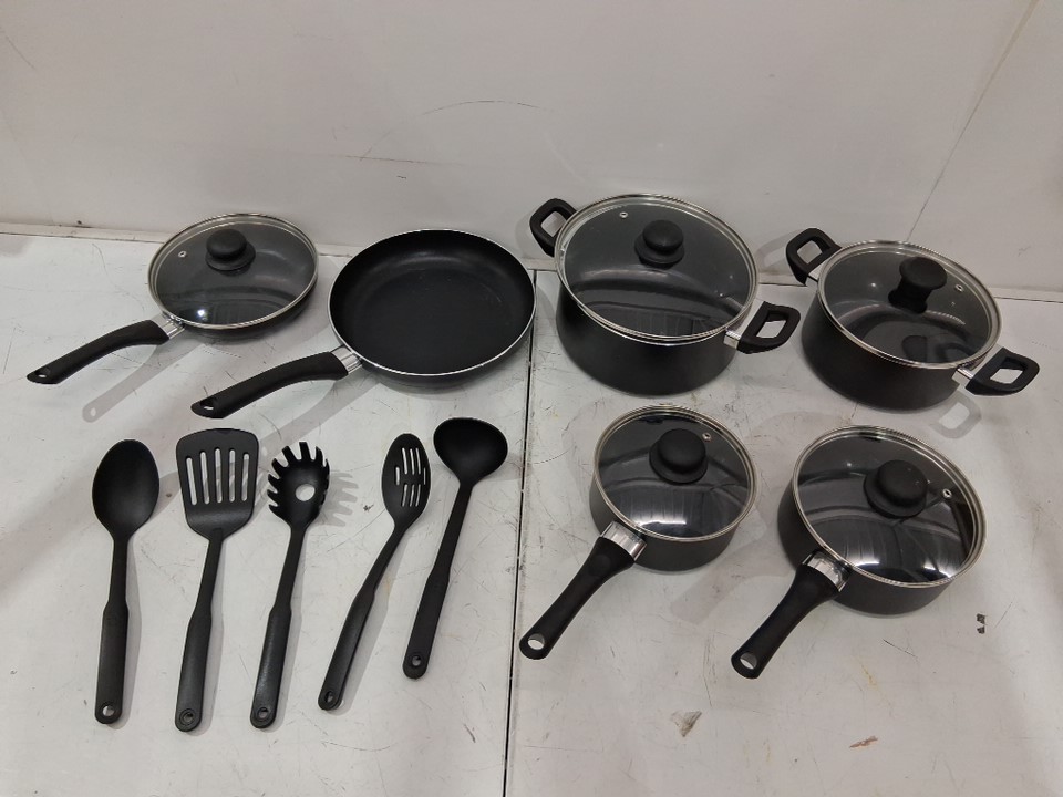 15PC AMAZON BASICS NON-STICK COOKWARE SET WITH POTS, PANS, AND UTENSILS