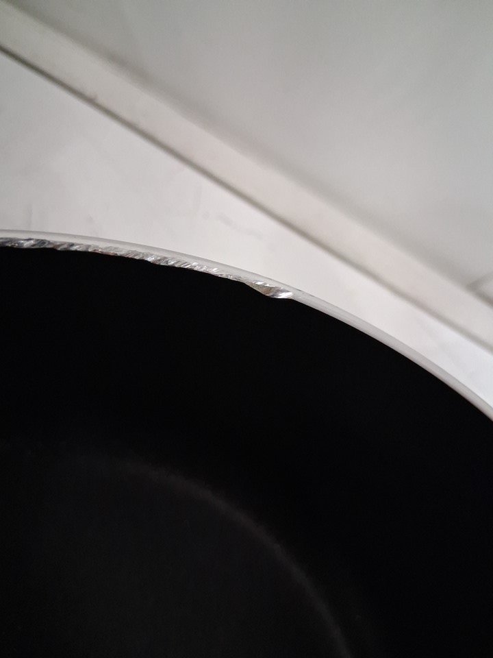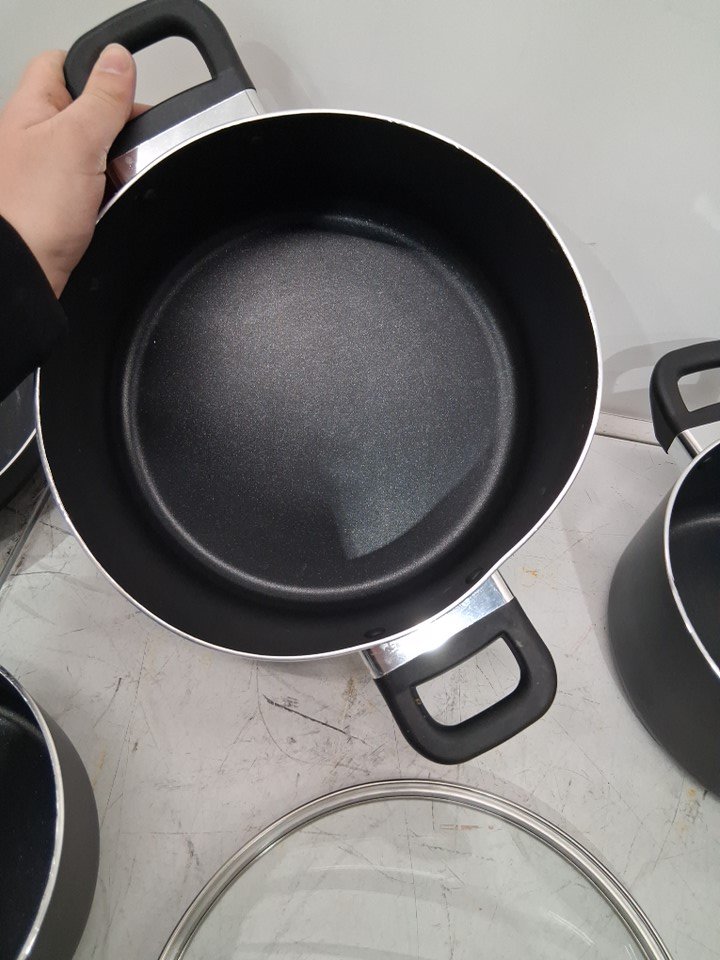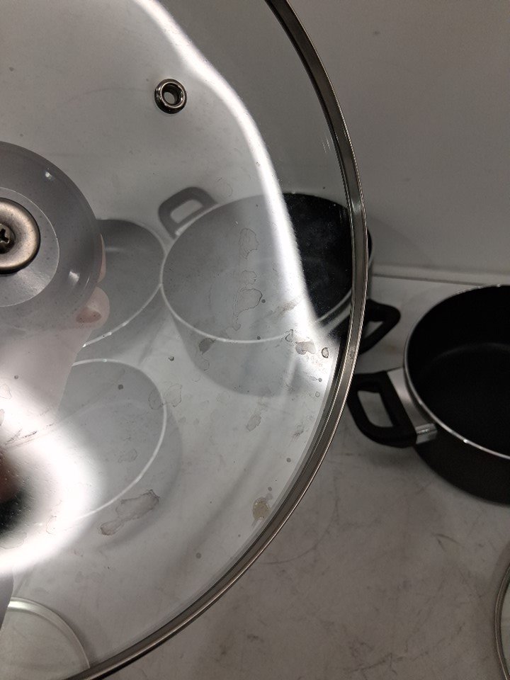 The big pot is dented out of shape. The smaller pot has minor dents on the rim. Signs of use with discoloration in the pans and food residue on the lids. See photos.