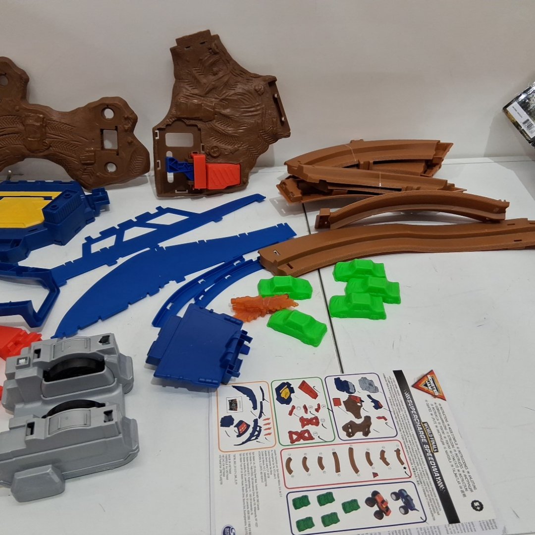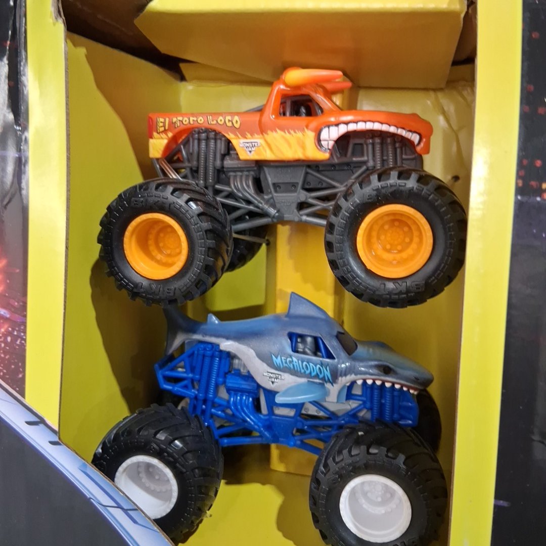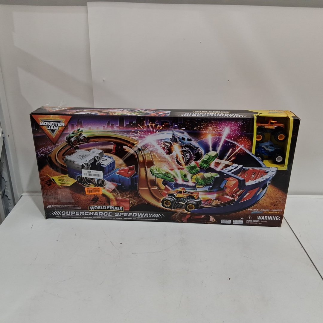 kids Monster Jam Supercharge Speedway Light Up World Finals Track Playset with Megalodon and El Toro Loco Die-Cast Monster Trucks