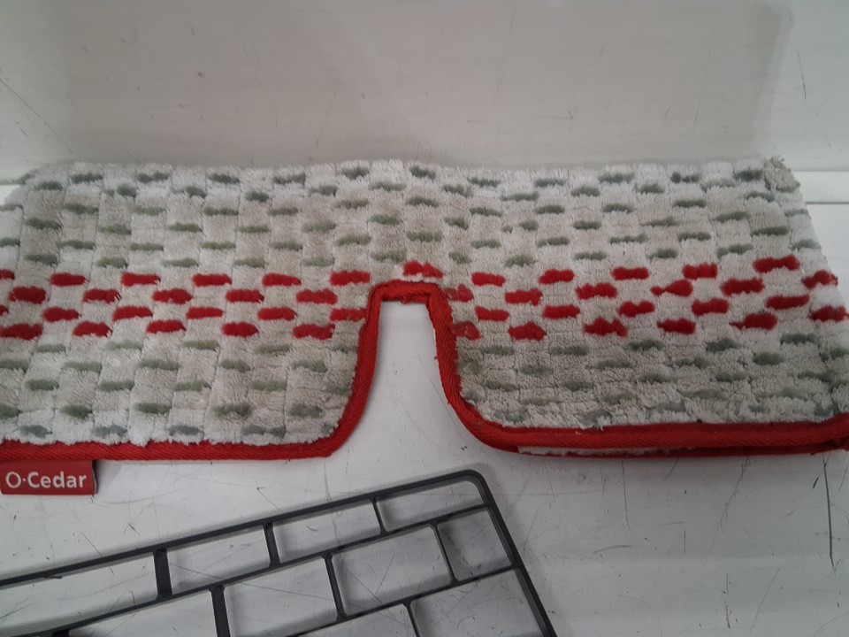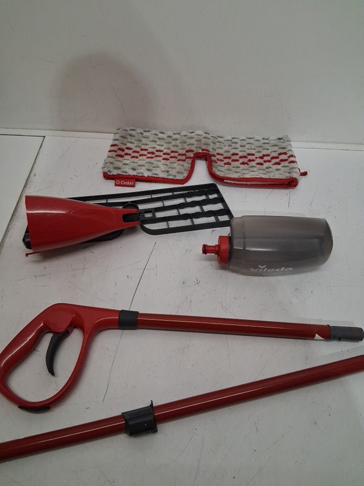 Mop head has dirt, spray bottle has spots from prior use -