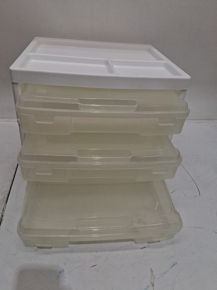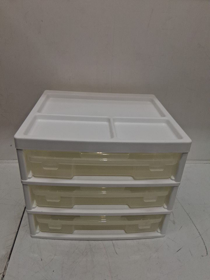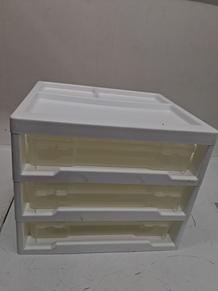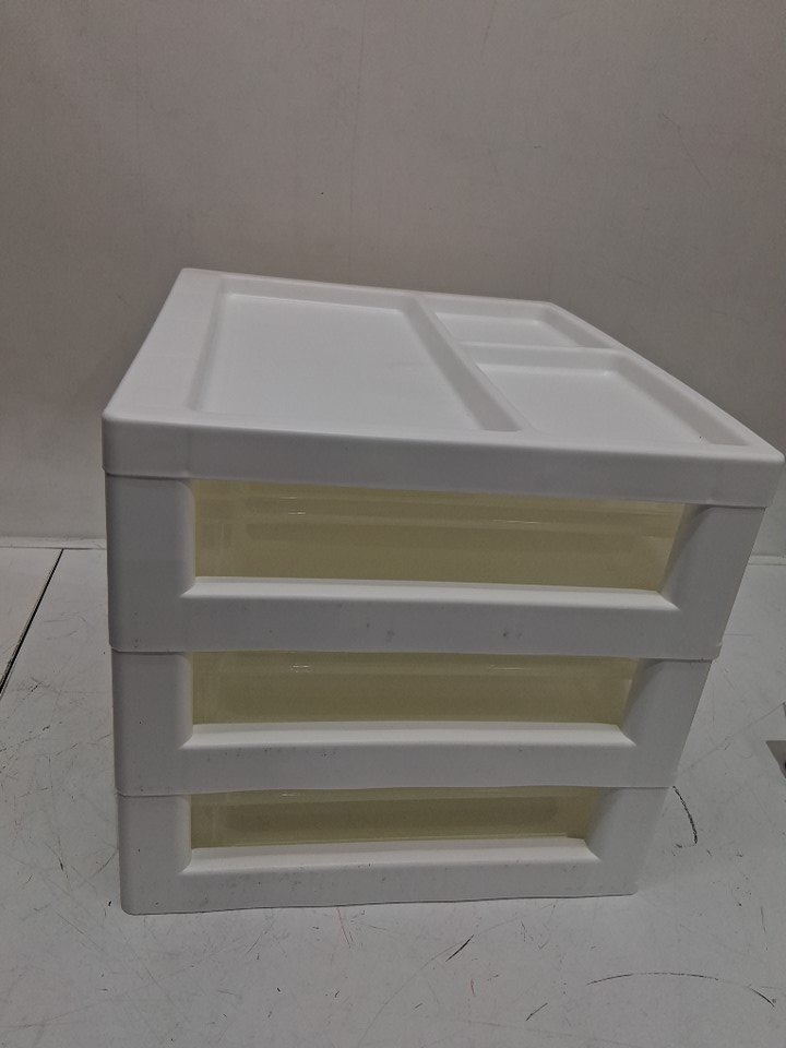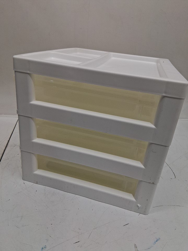 Item has scuffing/dirt marks all over and some yellowness on the drawers from previous use, see photos for reference.