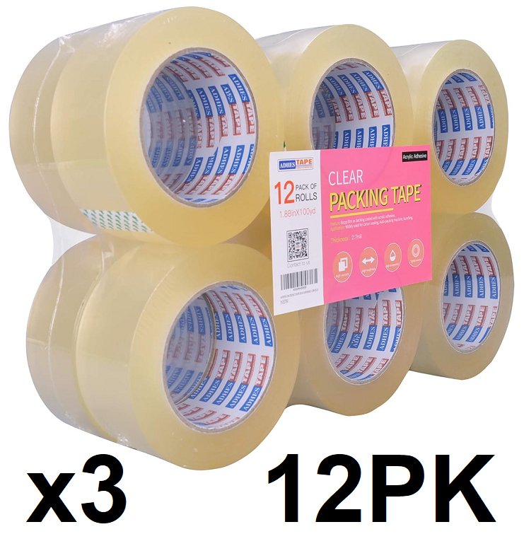 3 (12PK) ADHESTAPE ACRYLIC ADHESIVE PACKING TAPE - 1.88" x 100YD - CLEAR (36 TOTAL ROLLS)