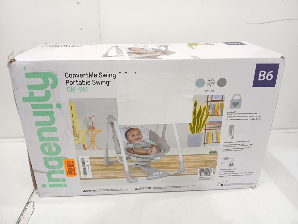 Ingenuity 2-in-1 convertme compact portable baby swing & seat with vibrations & nature sounds - battery powered - 20lbs max- raylan theme/grey (model: ‎12189)