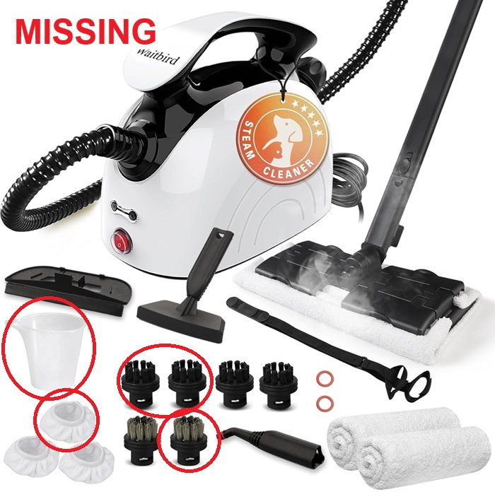 This product was tested for power. This Product is missing some accessories such as a measuring cup, 3 brush heads, and one of the cloth covers. Light use throughout.