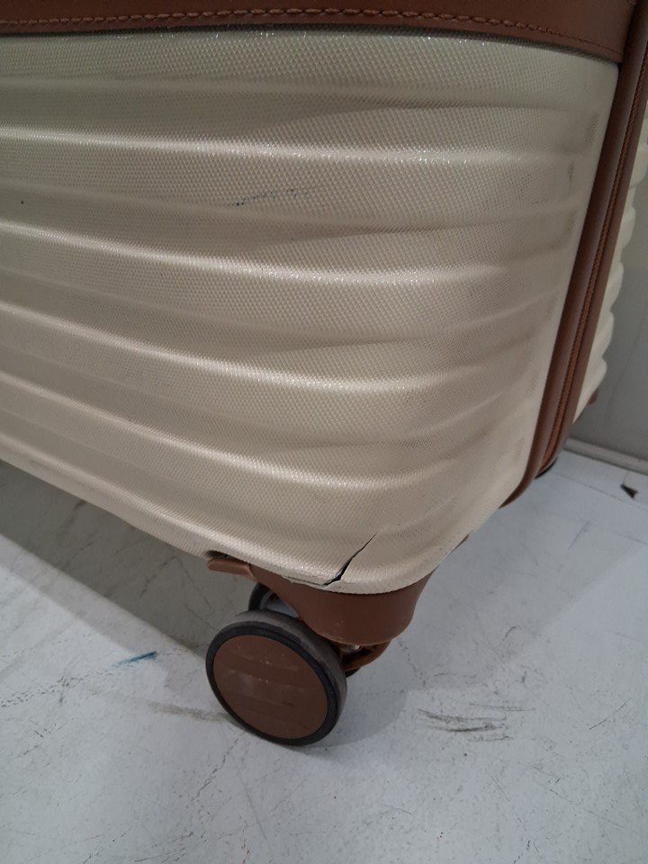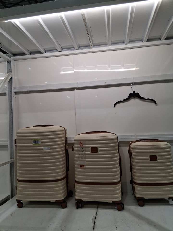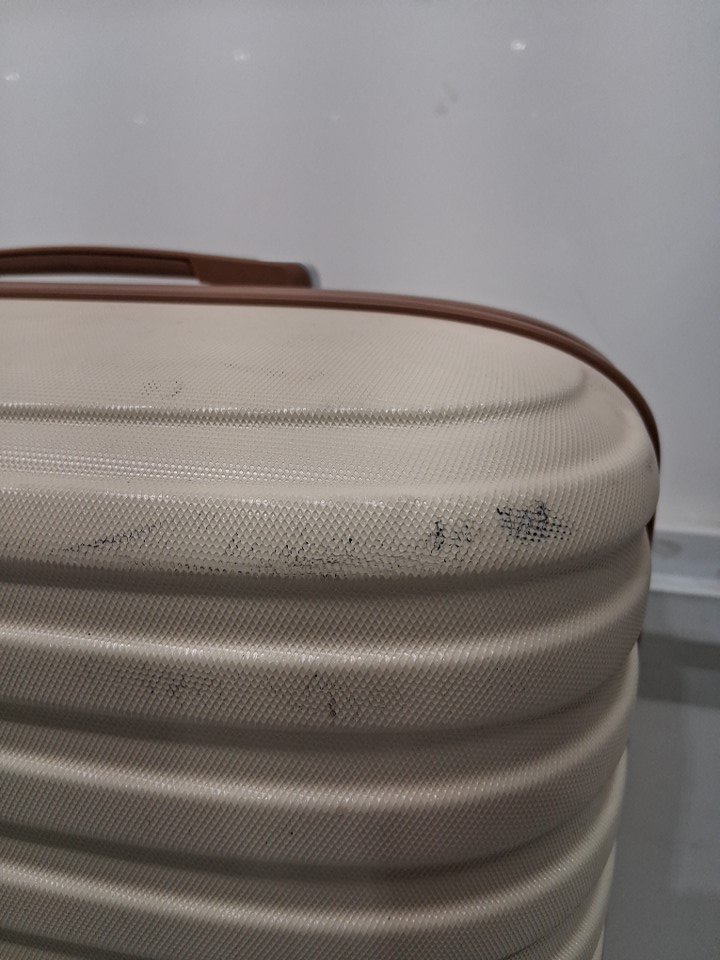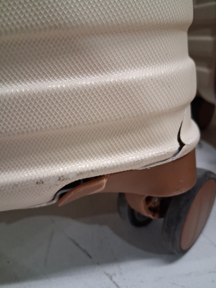 Each luggage bag has multiple spots with scratches scuffs and some staining from previous use. The largest carry on has a broken wheel and both small bags which come with this set look to have some sort of blue marker stains and other stains present inside the bags and on the outside surface.