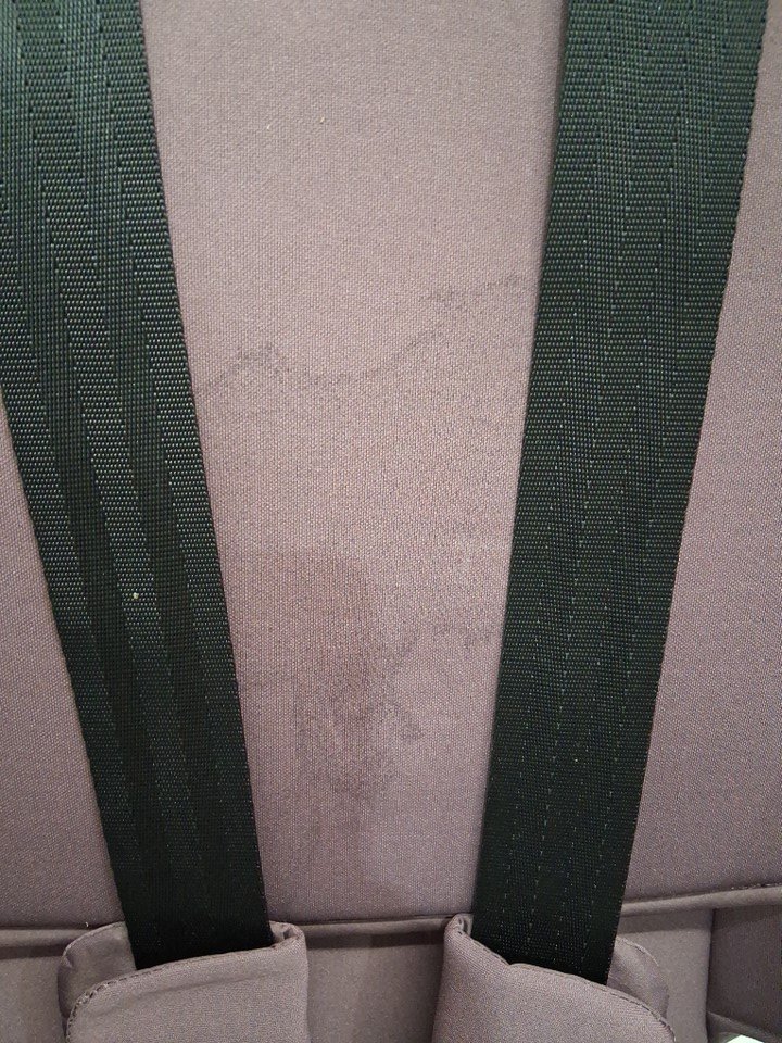 Light stain in middle of seat back, likely caused by distressed packaging. (See photos)