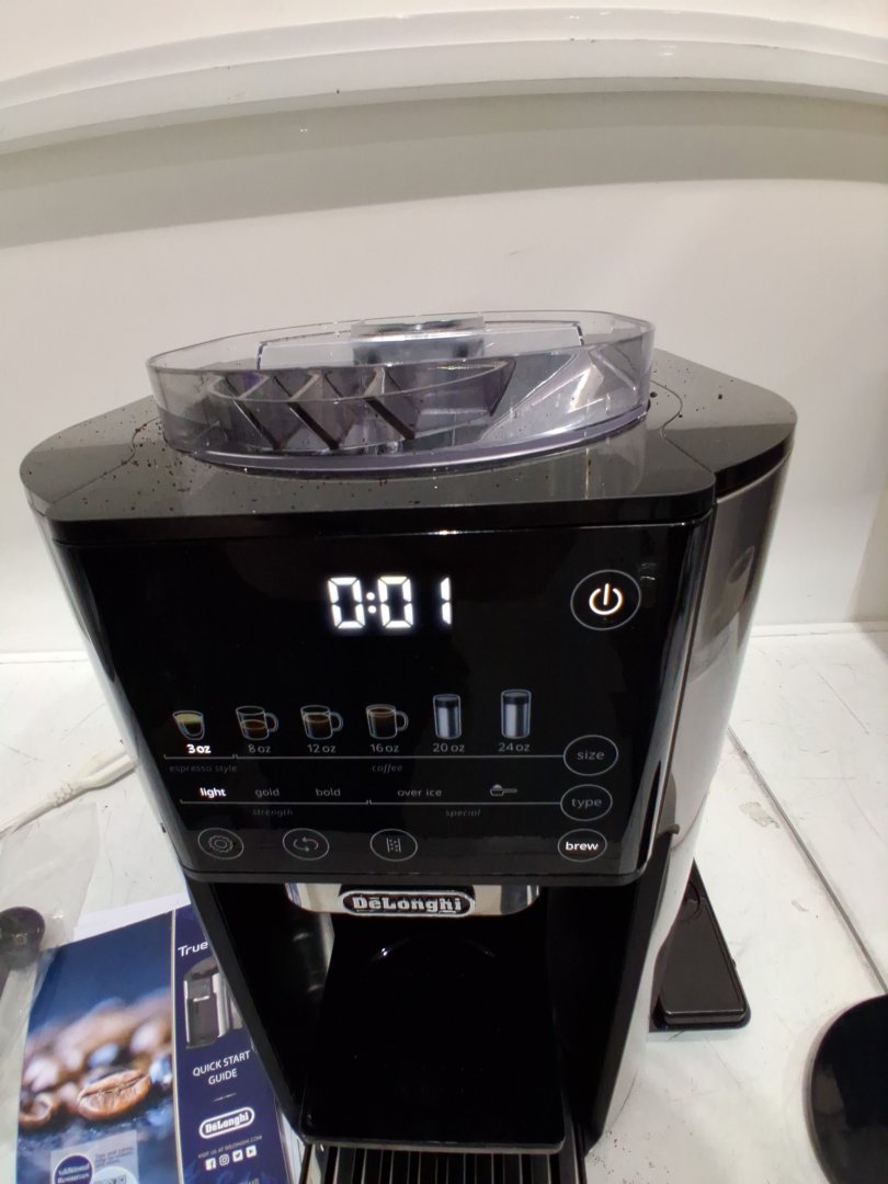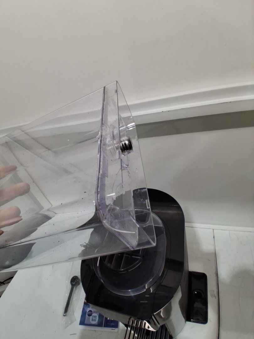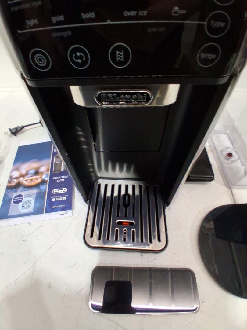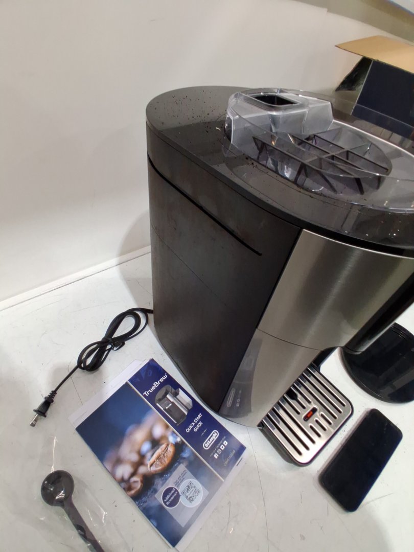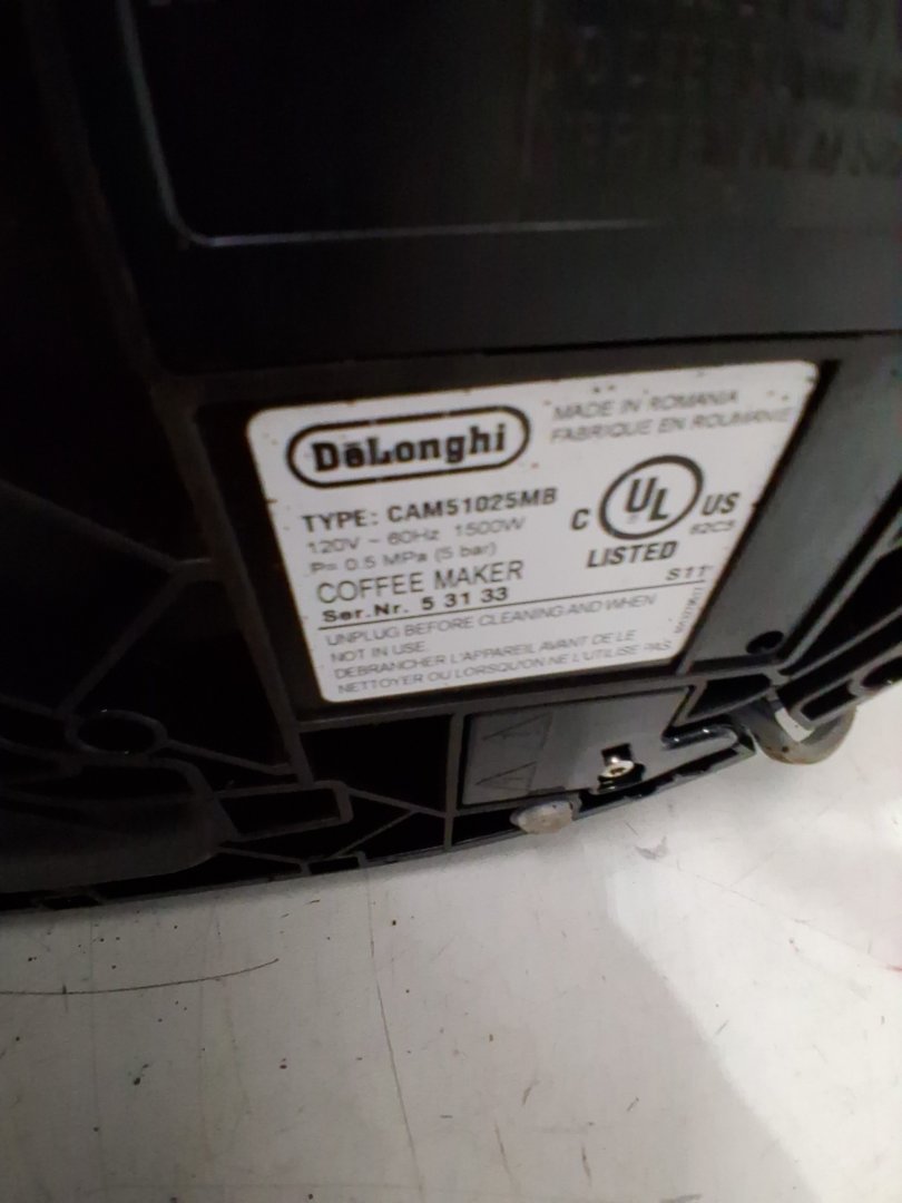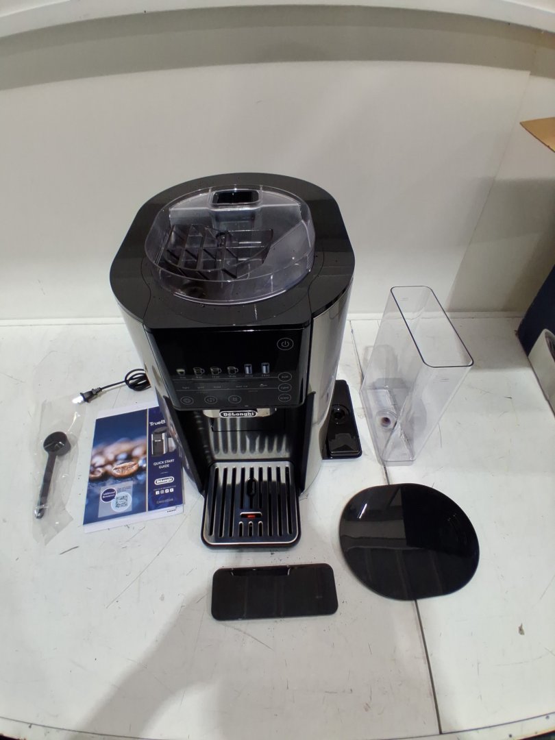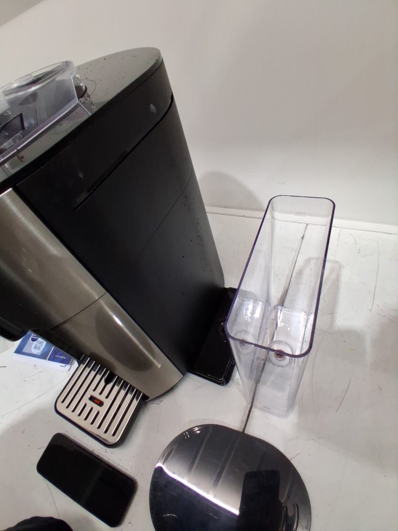 Tested for power, working. Signs of light use, coffee ground on and in machine. Water tank is chipped/cracked, may be able to glue. Or buy a replacement water tank. See photos
