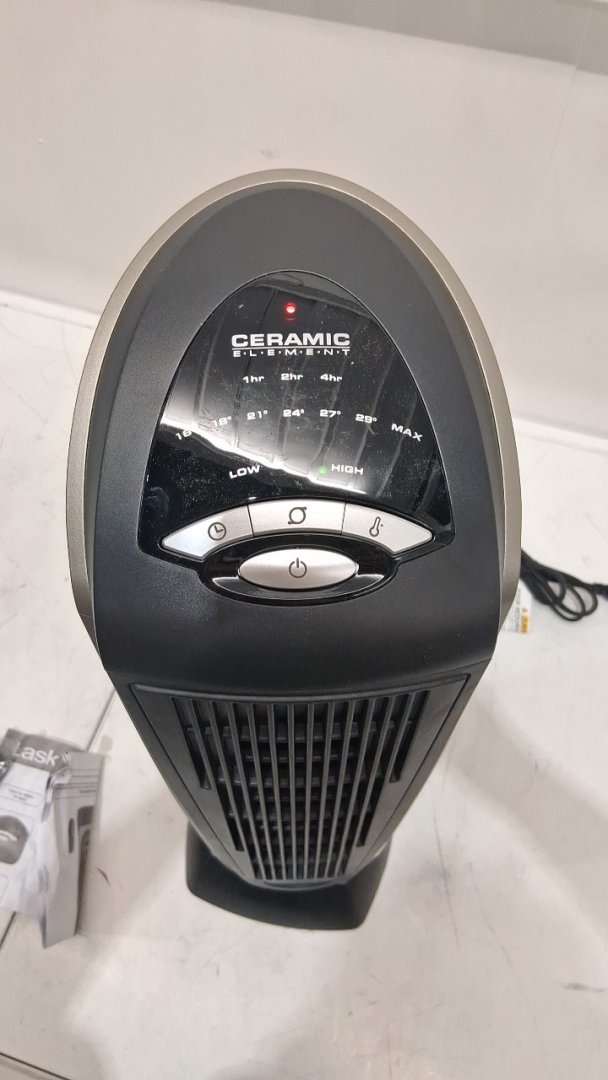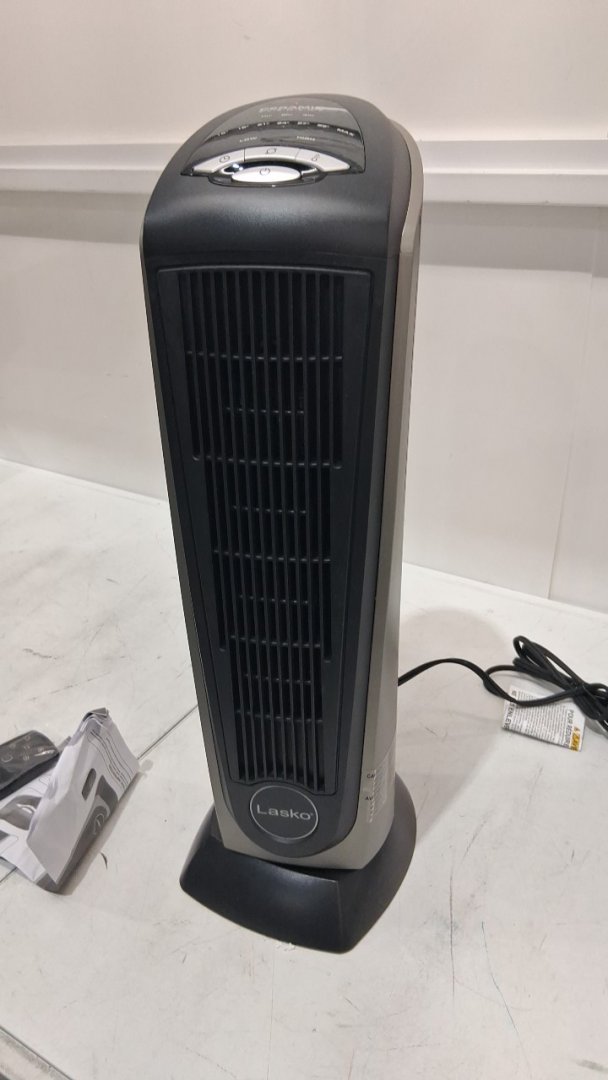 LASKO oscillating CERAMIC TOWER SPACE HEATER with 2 heat settings and 7hr auto-off timer with remote - 1500w - 23" height - grey/black (model: 751320C)