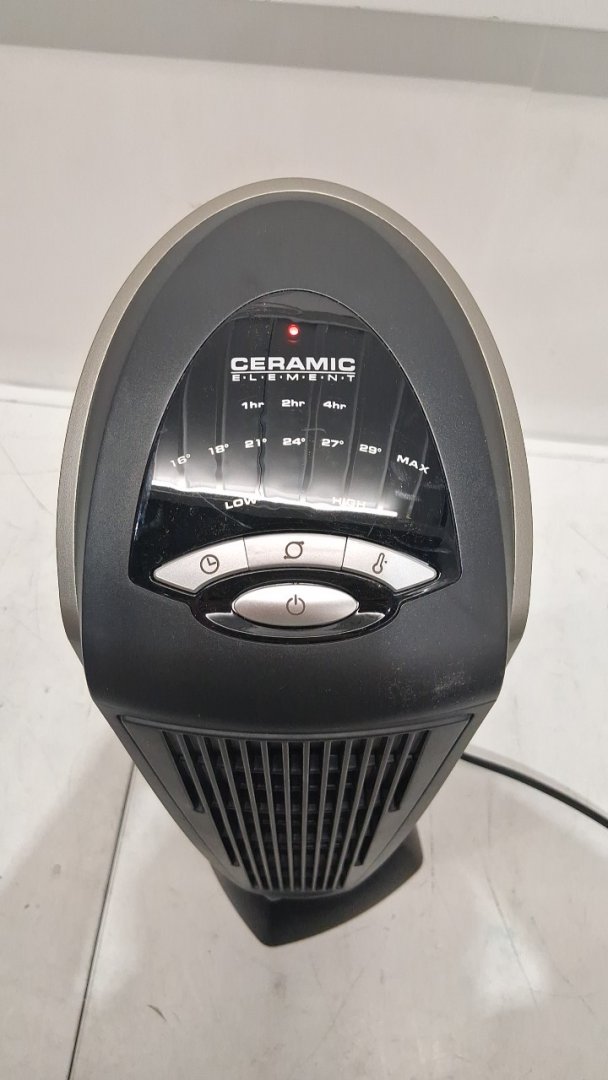 LASKO oscillating CERAMIC TOWER SPACE HEATER with 2 heat settings and 7hr auto-off timer with remote - 1500w - 23" height - grey/black (model: 751320C)