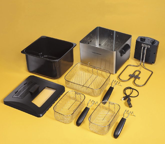 item is covered in used cooking oil inside and out, item is missing 2 of the 3 handles and the 2 smaller baskets