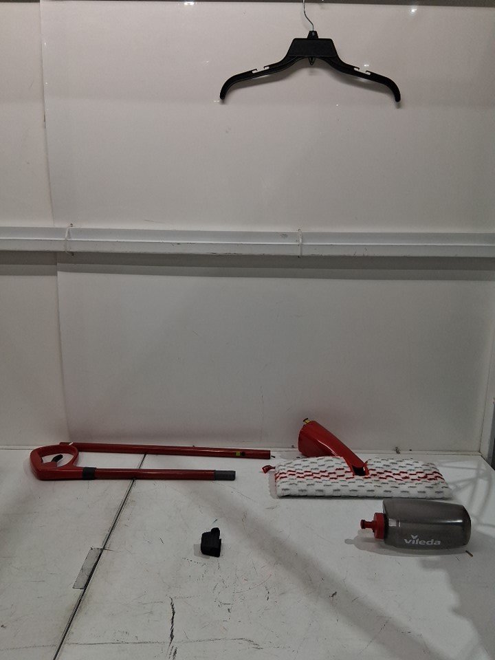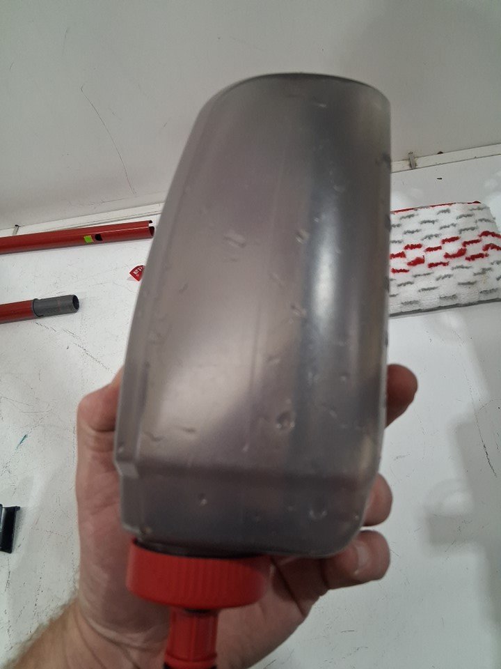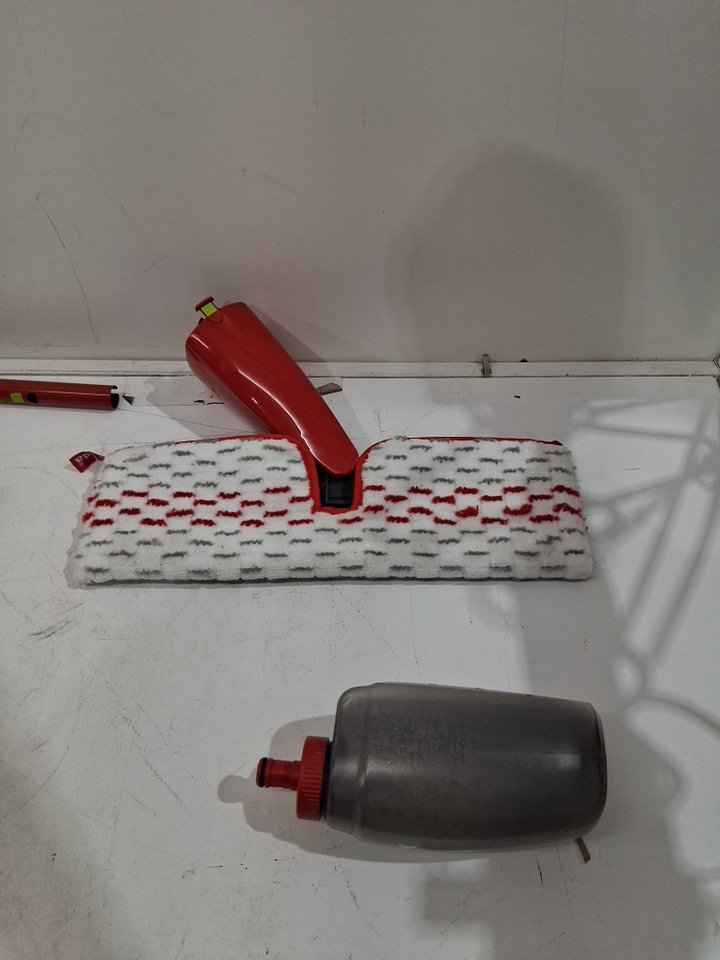 Mop head has light dirt discoloration and cannister has water drops inside