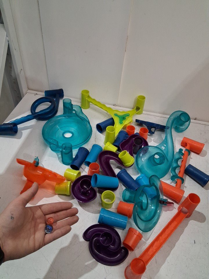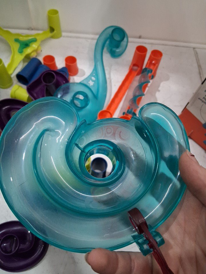 some of the pieces have some scuffs on them and a rougher feel from marbles running over them there appears to be 7 pieces missing, unable to confirm which pieces due to no manual