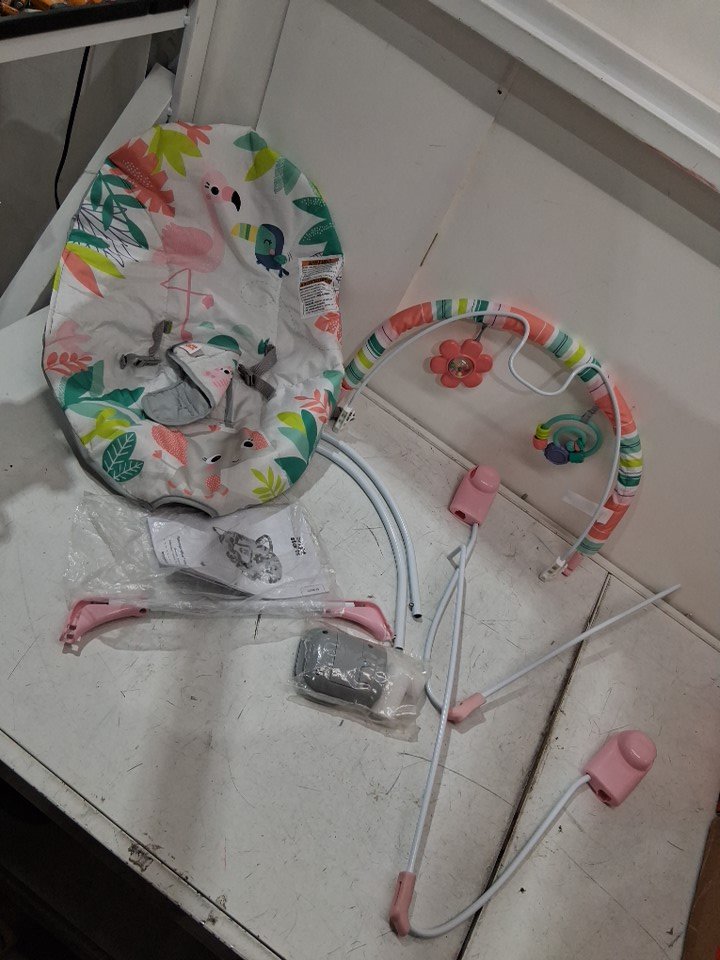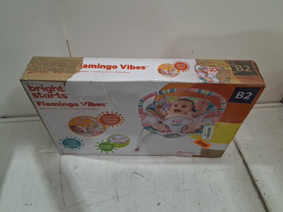 BRIGHT STARS 3 point harness VIBRATING BOUNCER WITH TOY BAR - FLAMINGO VIBES (MODEL:12228)