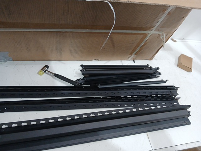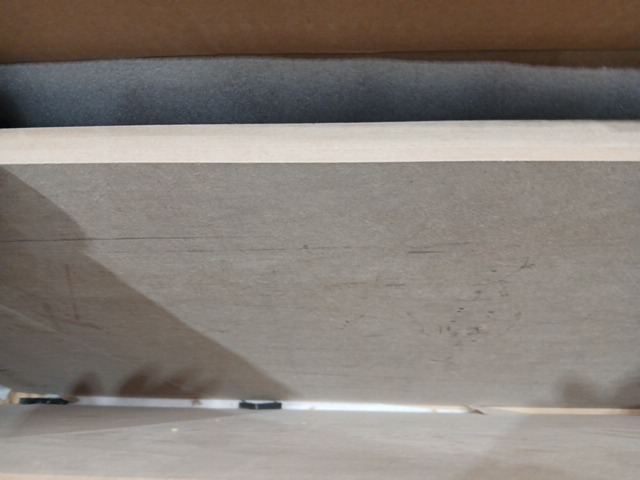 There are scuff marks on the shelving and the hardware is missing.