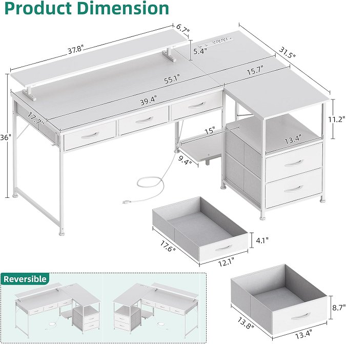 Mexin L Shaped Computer desk with 5 fabric drawers - 55" - White (model:MX-LZ5C-WH-CA)