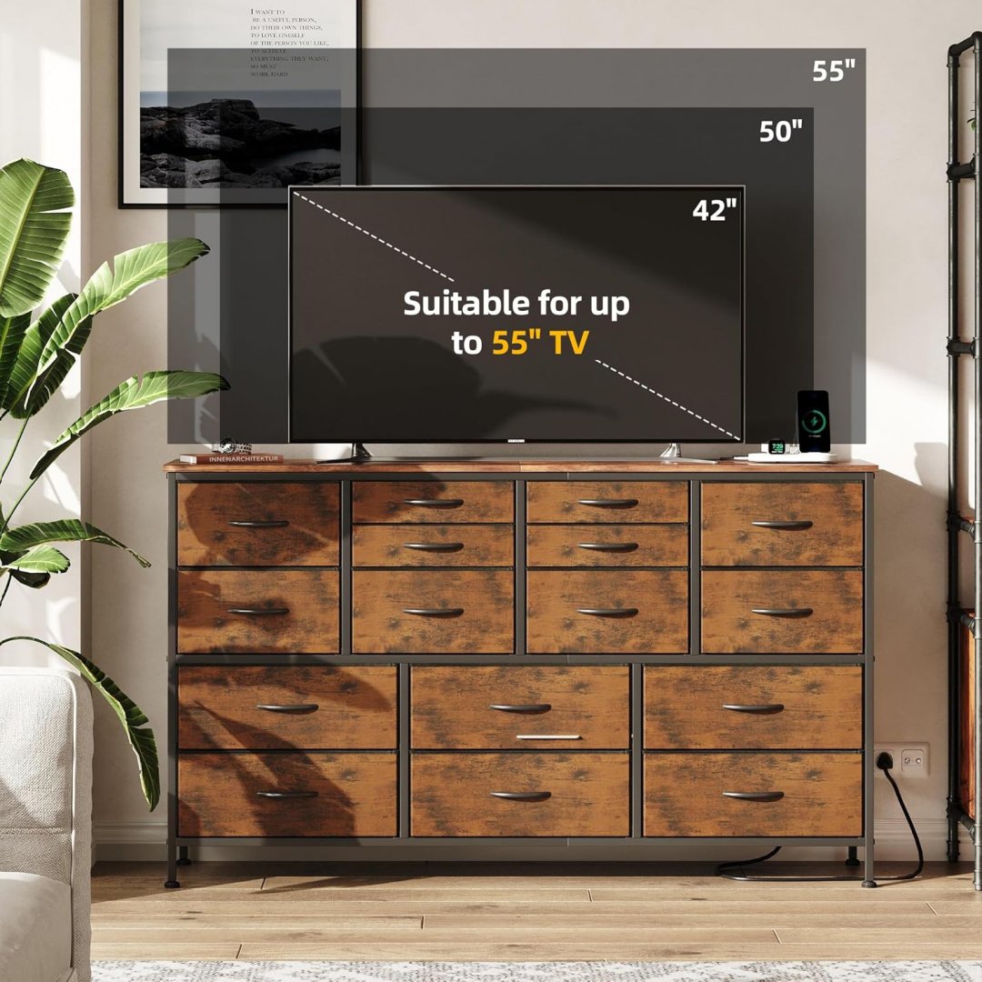 caiyun 16 drawer fabric bin dresser/tv stand with power outlet - 49" x 12" x 35" - rustic brown/black - (model: h0101869/‎CY-HS1601-VT)