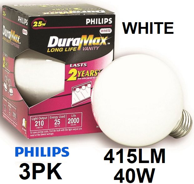3PK PHILIPS DURAMAX LONG LIFE MEDIUM BASE BULBS - 415LM - 40W - 2000 LIFE HOURS - WHITE