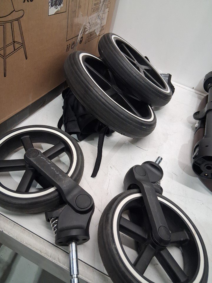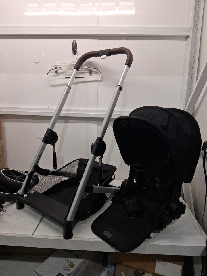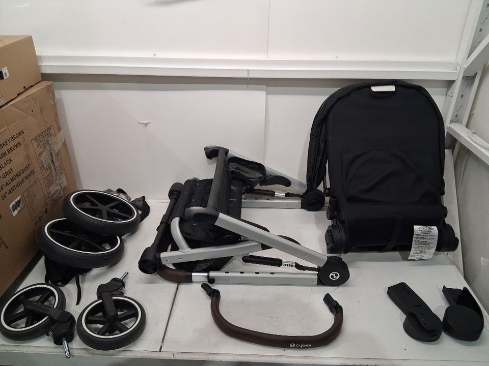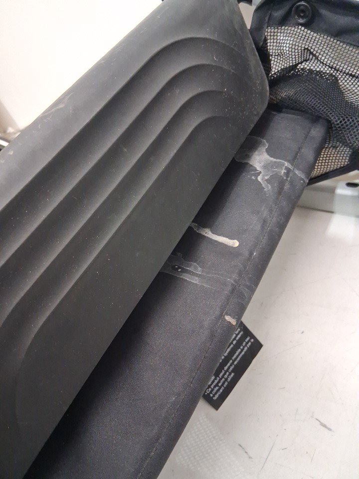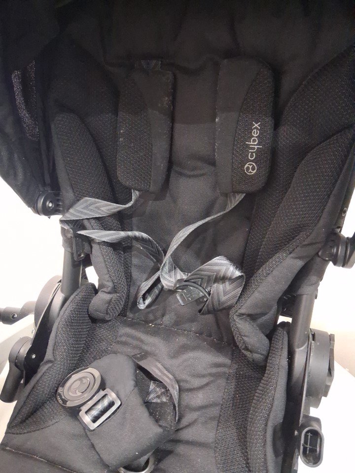 Wheels have dirt discoloration, mud/dirt stains on bottom basket, and seat/seatbelt has visible dirt and stains on it