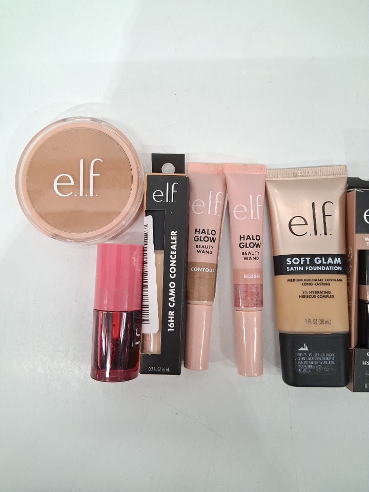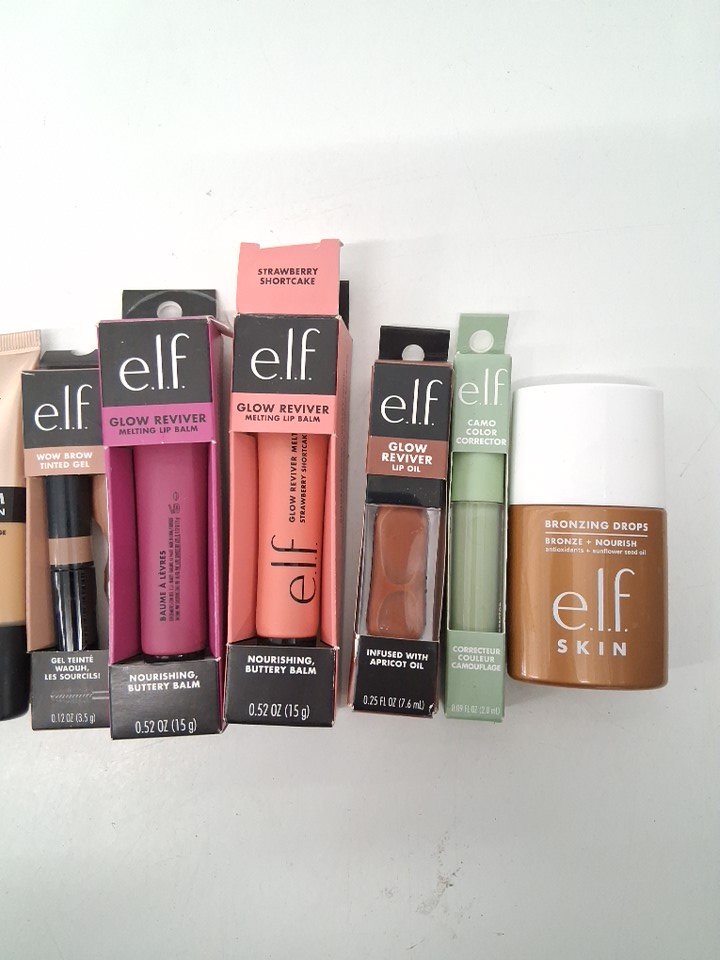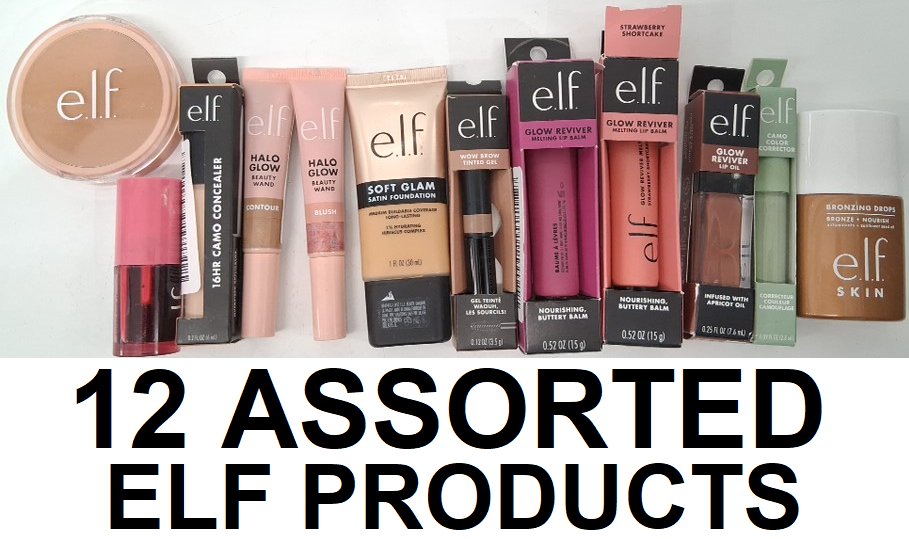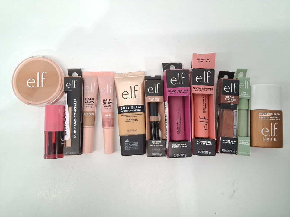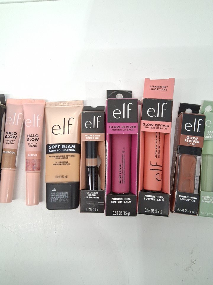12 assorted elf products - assorted colours, shades and types - concealer / foundation / lip balm / colour corrector / blush / contour / brow gel-
