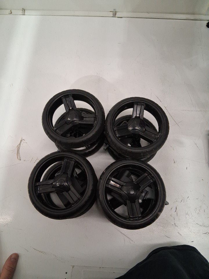 The wheels have some staining from previous use and also the underside area also has some splash up very light staining from dirt or mud.