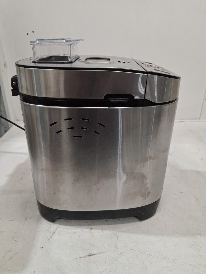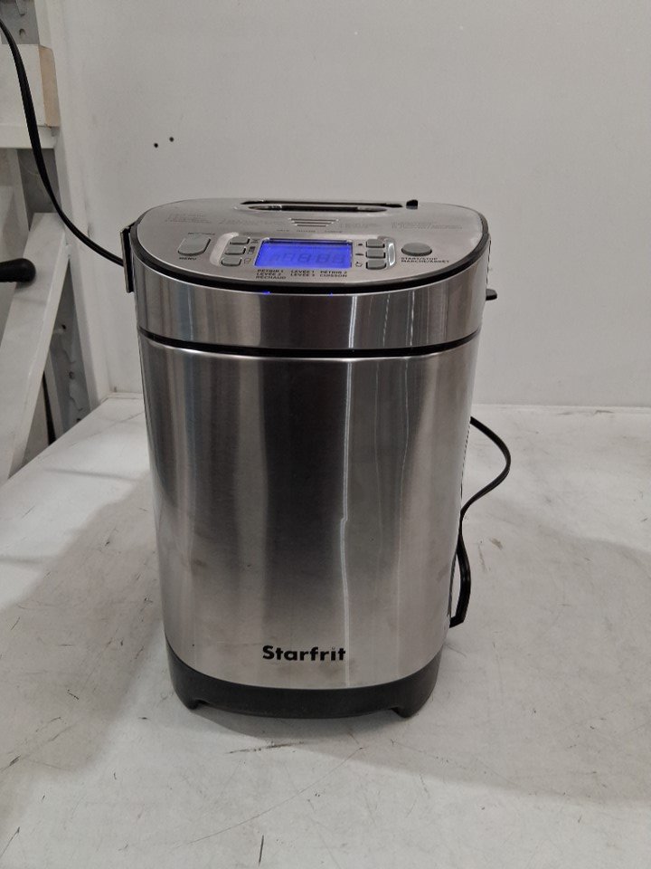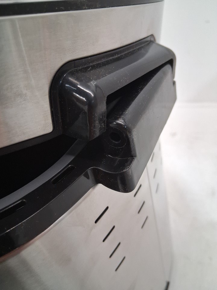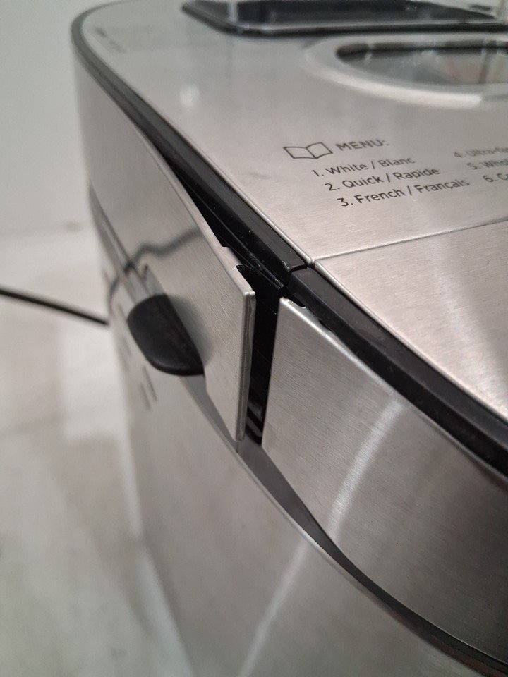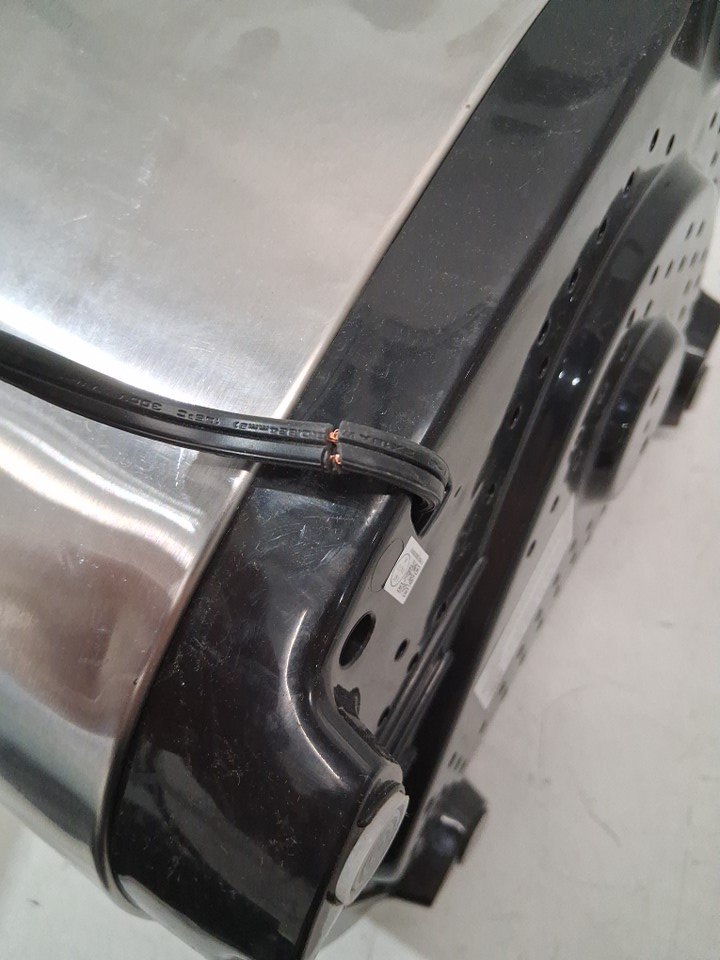 The lid is missing a screw on one side, one part of the metal is popped out of place on the side of the lid, and there is a small dent in the front of the machine. The power cord is also slightly damaged and some of the copper wiring is visible, but power appears to function without any issues - see photos. Outside of the cosmetic damage, appears to be in good condition without any signs of use or obvious issues.