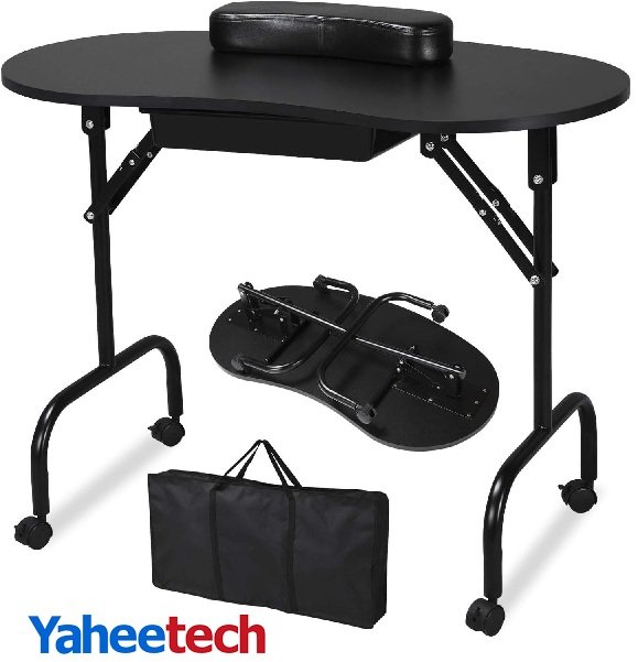 yaheetech Portable & Foldable Manicure Table Nail Desk Workstation with Drawer, Client Wrist Pad & carrying bag - 37" x 17.5" x 28.1" - black (model: 591782)