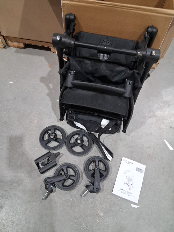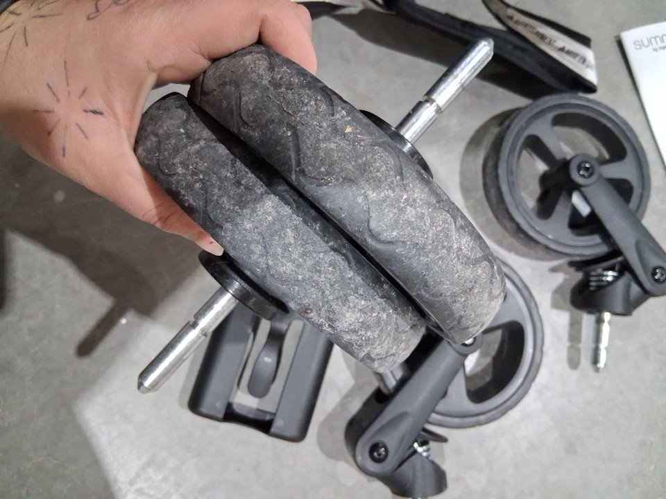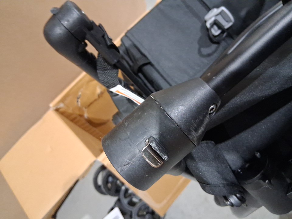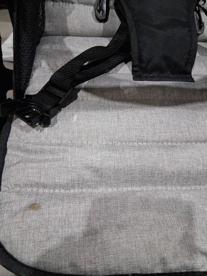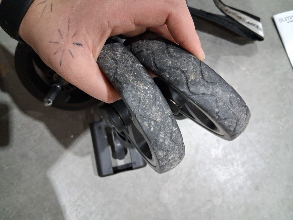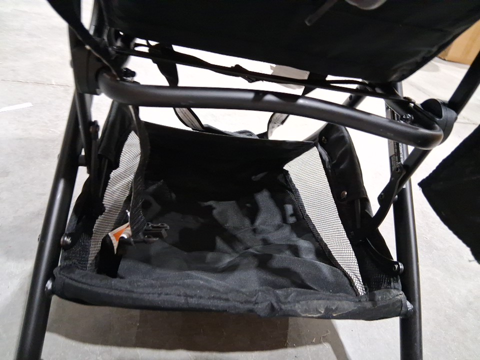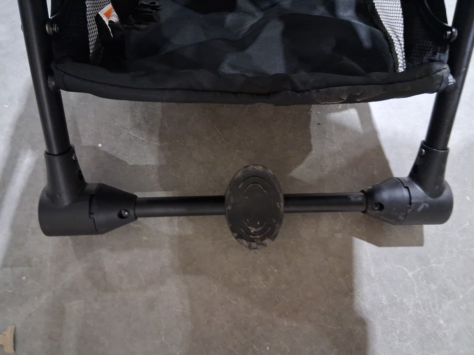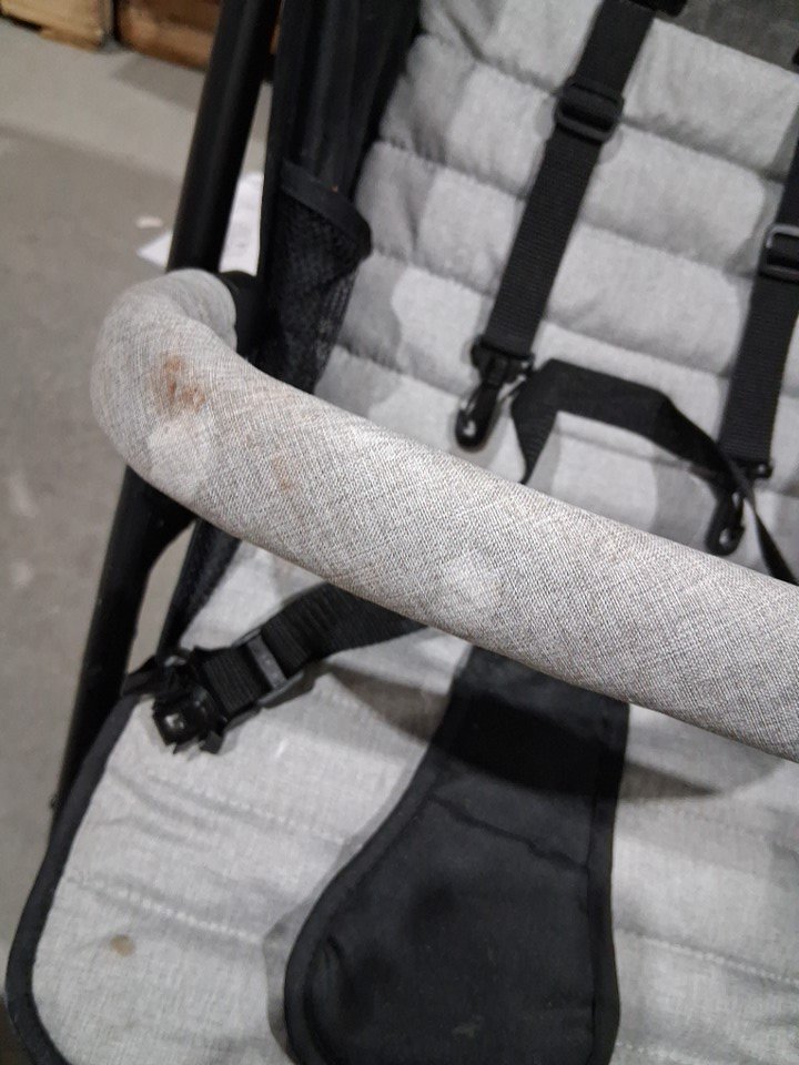seat and cross bar have some markings and wheels and assembly points have some dirt and light wear from previous use
