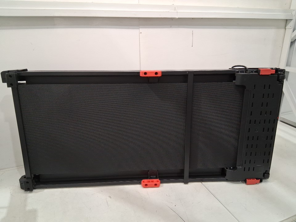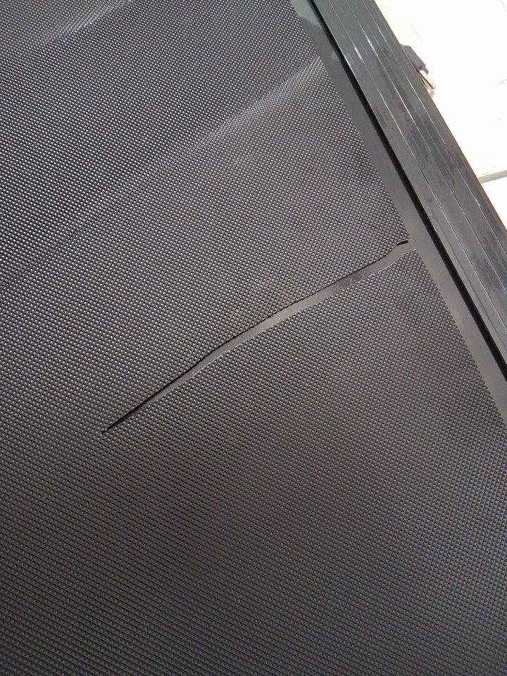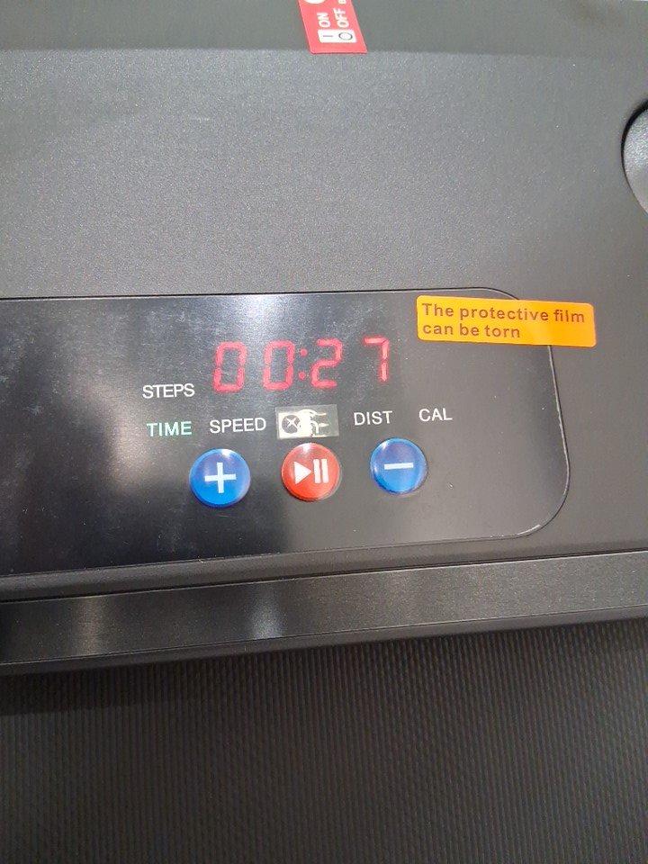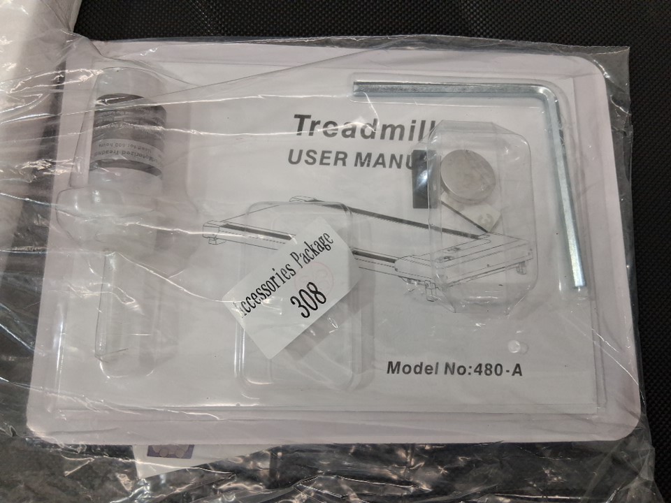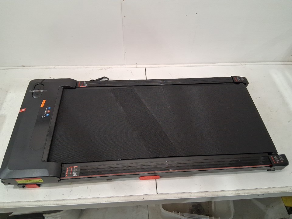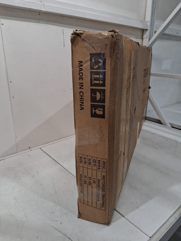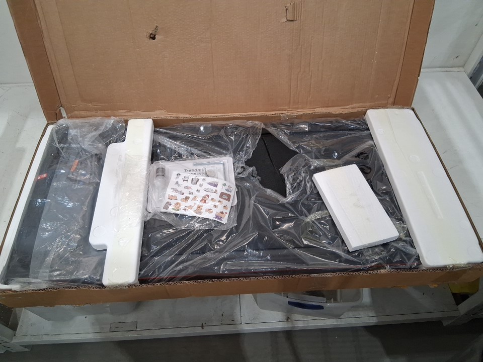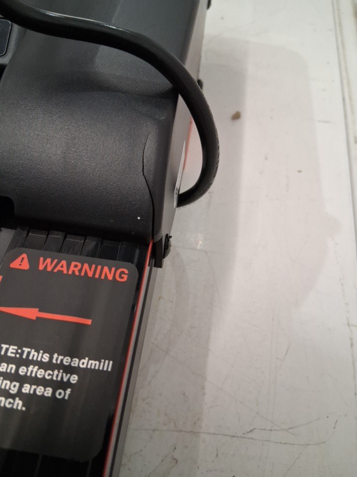 There is a large slash in the tread, likely due to a handling or manufacturing accident, and there is also a small crack in the right side of plastic frame, near where the power cord is located - see photos. Appears to be in new condition and function without any issues, but customer will need to repair or replace the tread in order to use the treadmill reliably.