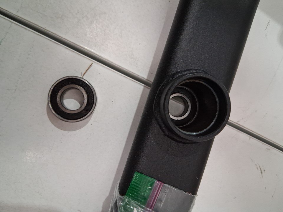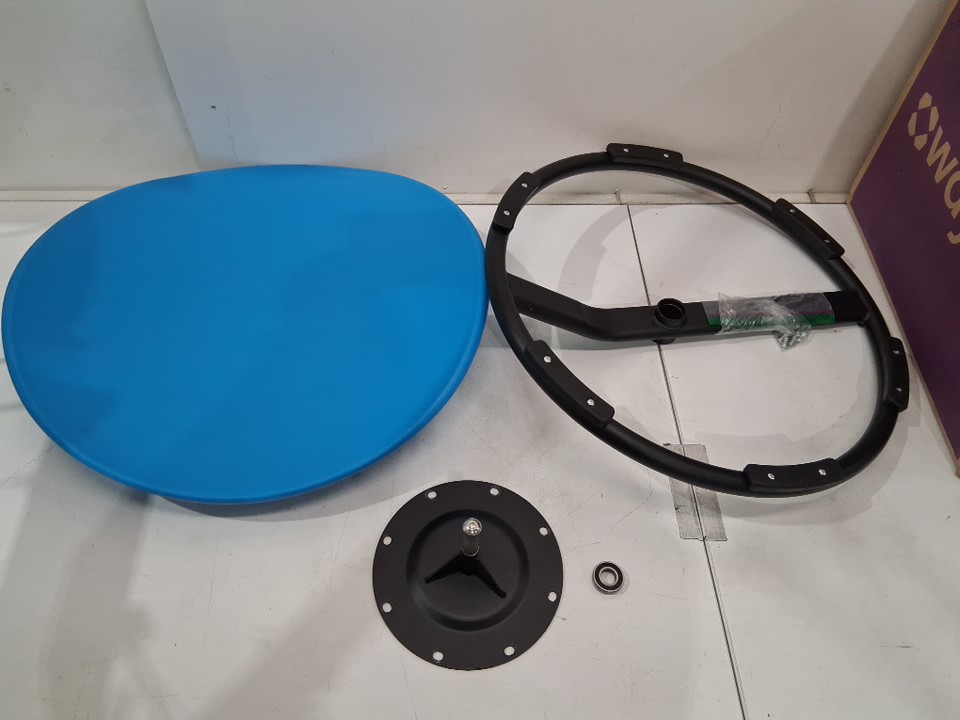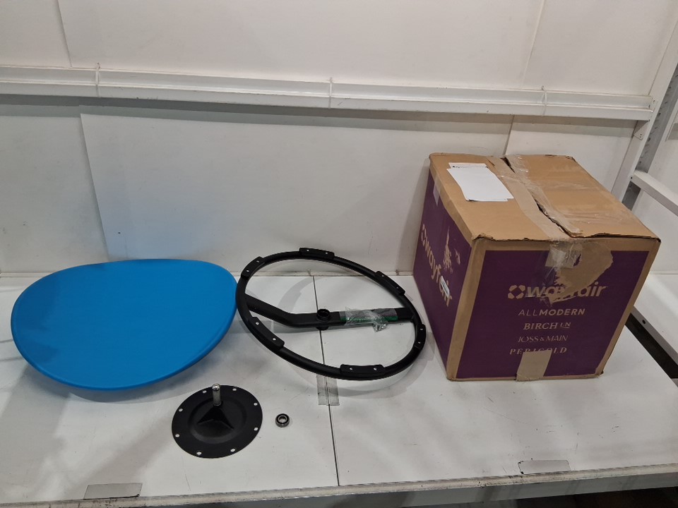 There are some light scratches/scuff marks on the pieces indicating previous assembly/use. Please note that one of the bearings is out of the base, but it should easily be pushed back in and is held with a bolt when assembled (see photos)