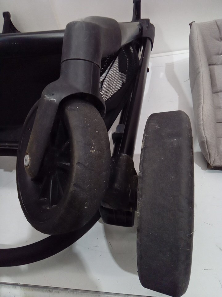 appears that the wheels have not tread left. may be able to replace. please note that the stroller seat has a stain (see photo)