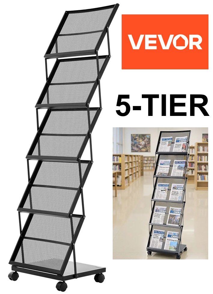 5-tier metal foldable brochure/literature display rack/stand with wheels - black (model: hs-z3)