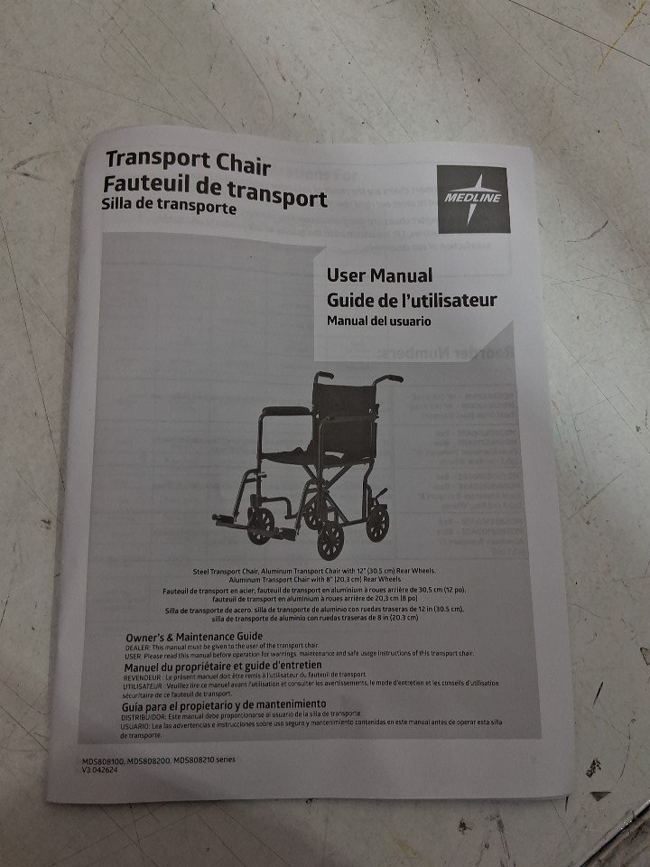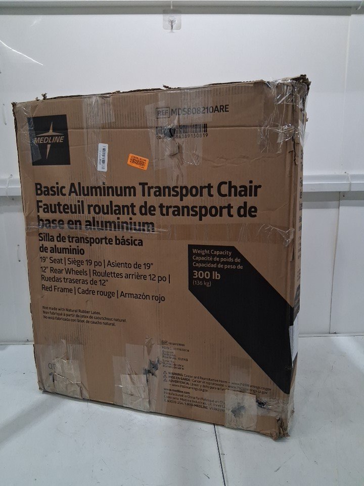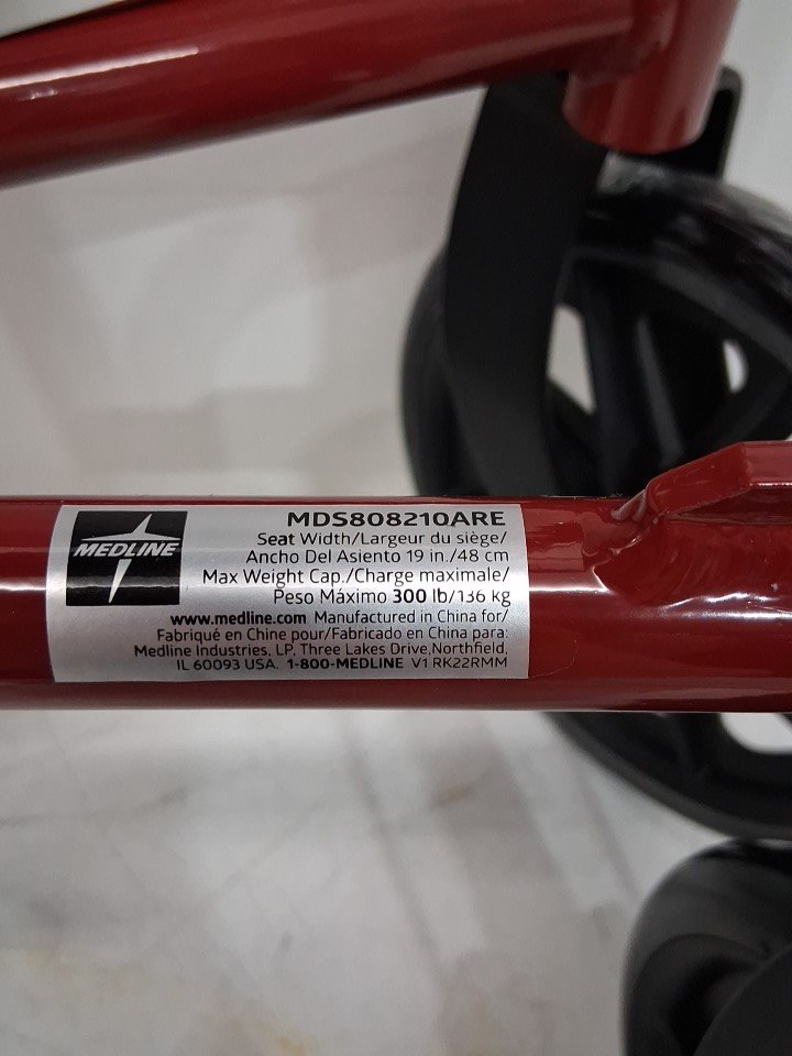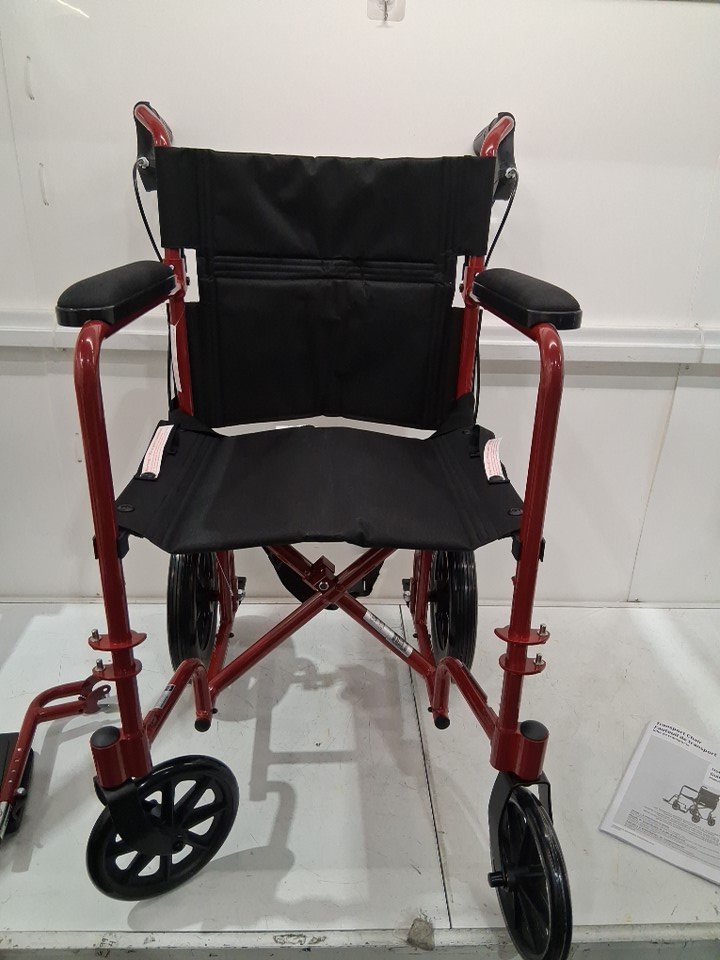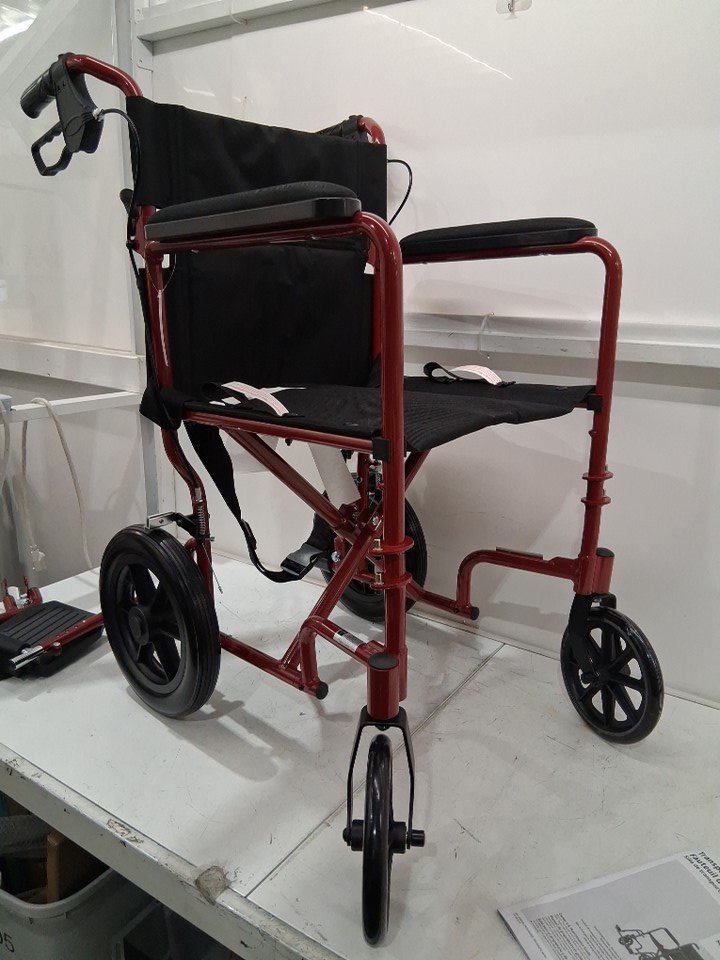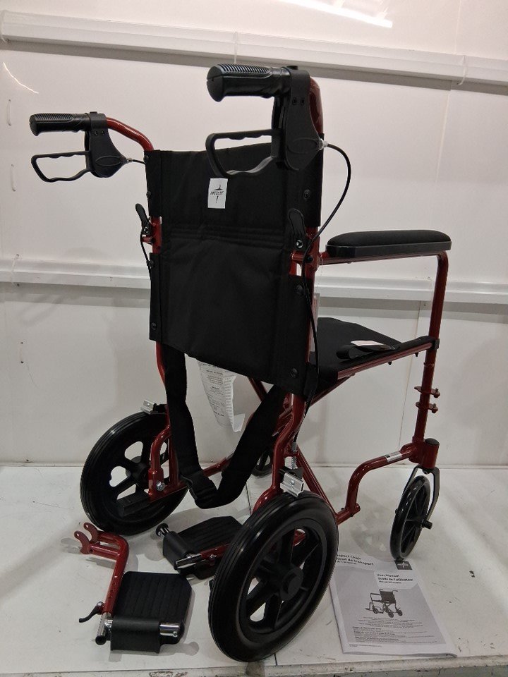 MEDLINE BASIC ALUMINUM TRANSPORT WHEELCHAIR - 19" - 12" REAR WHEELS WITH BRAKES - 300lbs capacity - RED (MODEL: MDS808210ARE)