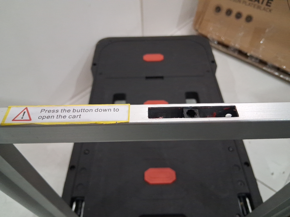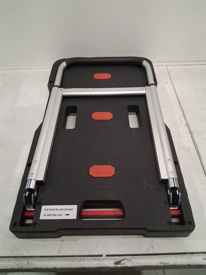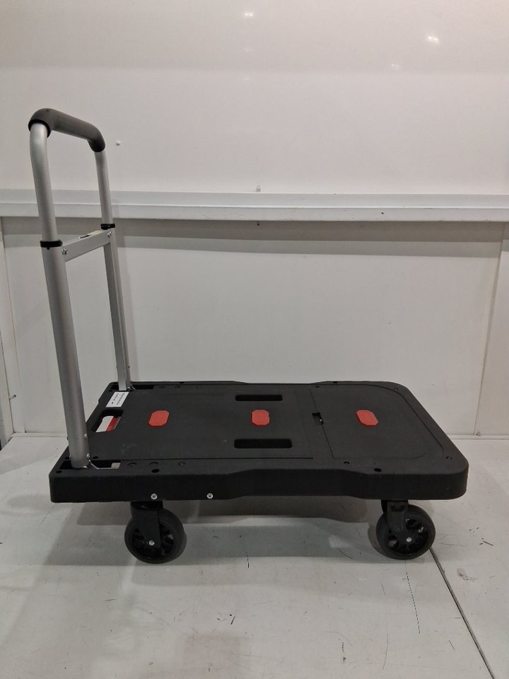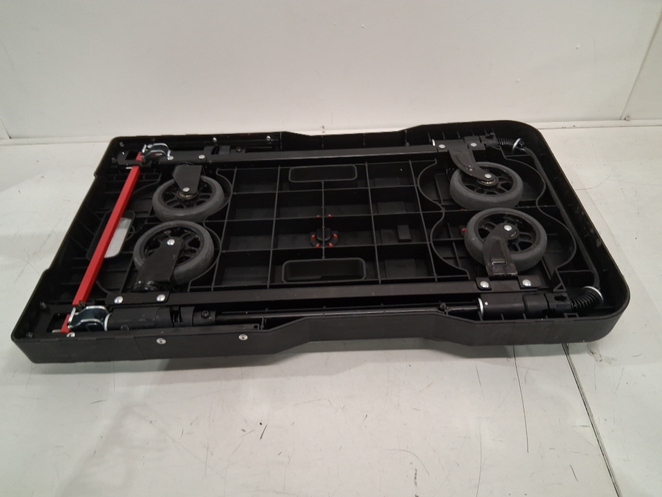 Please note: • The dolly shows signs of previous use with dust/scuff marks around the platform and wheels, see photos. • The button to raise the handle is missing but the handle can still be raised by pushing in the gap, see photos.