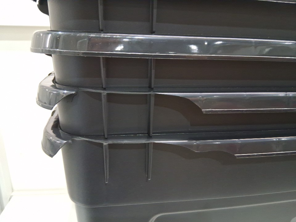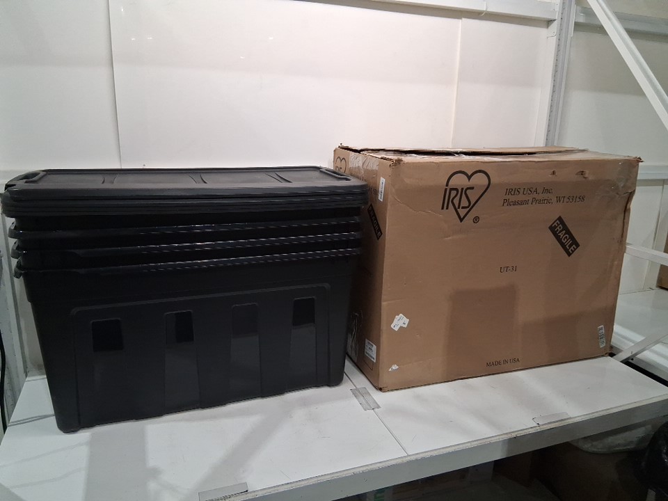 Please note that 2 of the bins and 1 of the lids are damaged, but all are still functional (see photos)