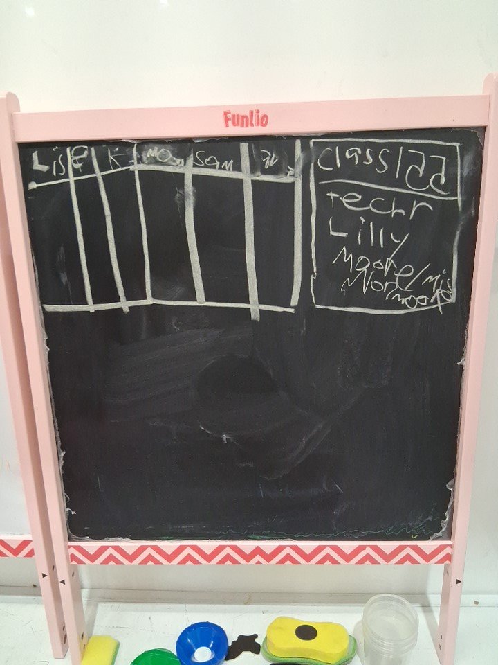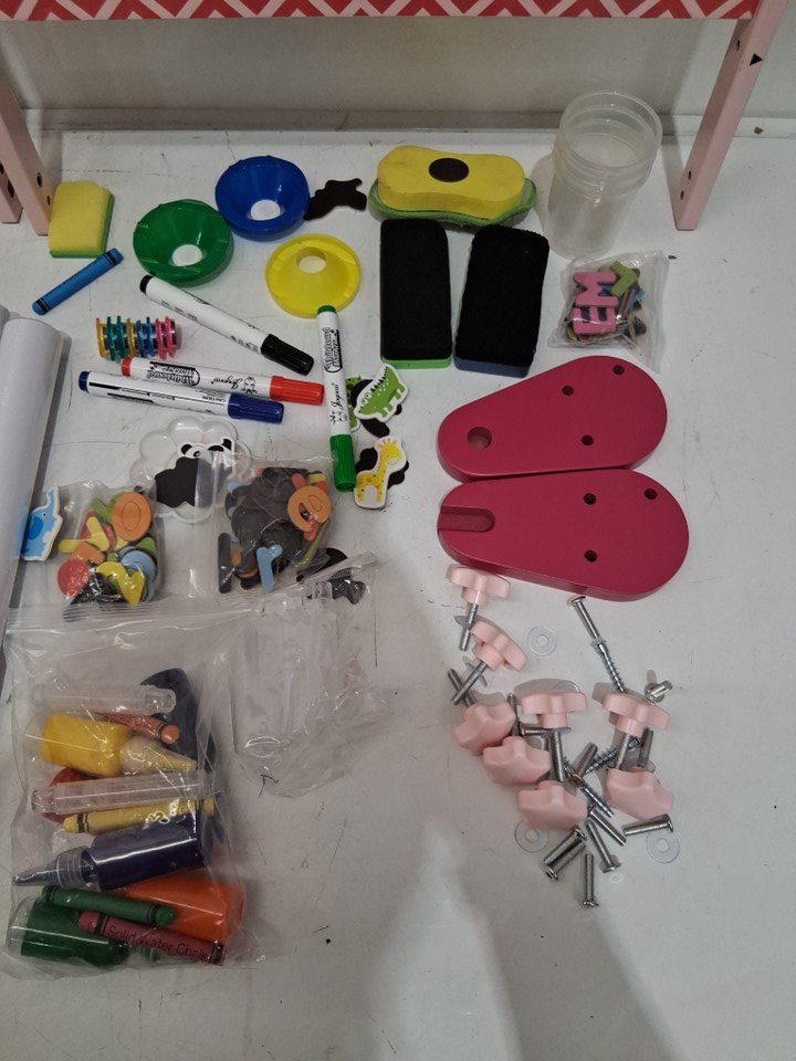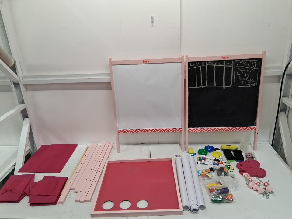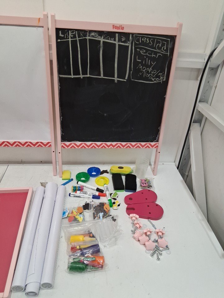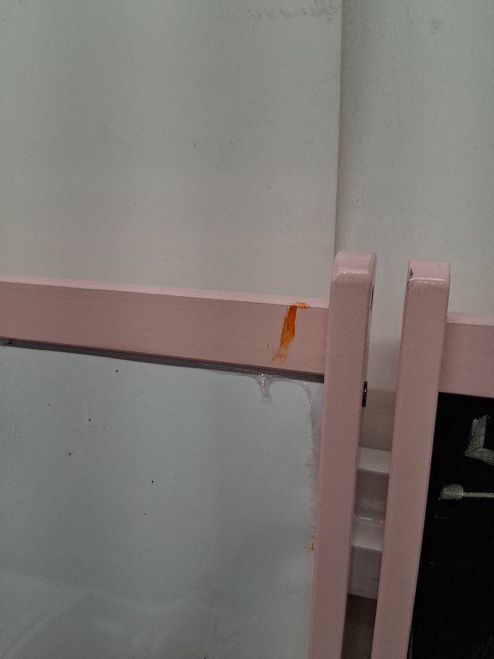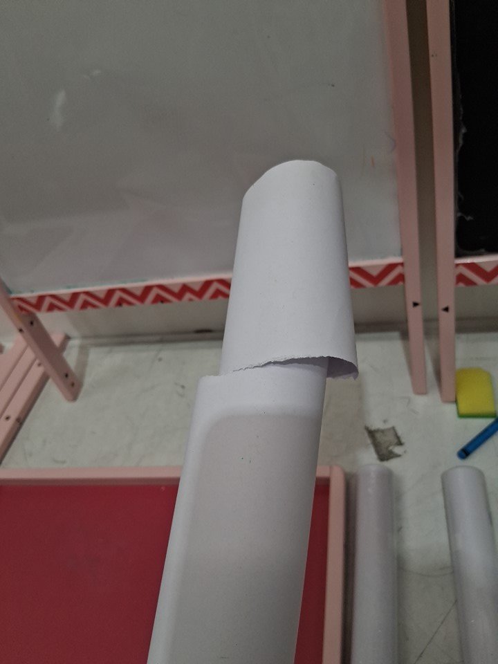 please note the product was discovered to have writing on it from previous use, along with this we found the product to be covered in dust, dirt, marker, and crayon, this can be cleaned. one of the paper rolls was also found to be torn, please see photos for more details