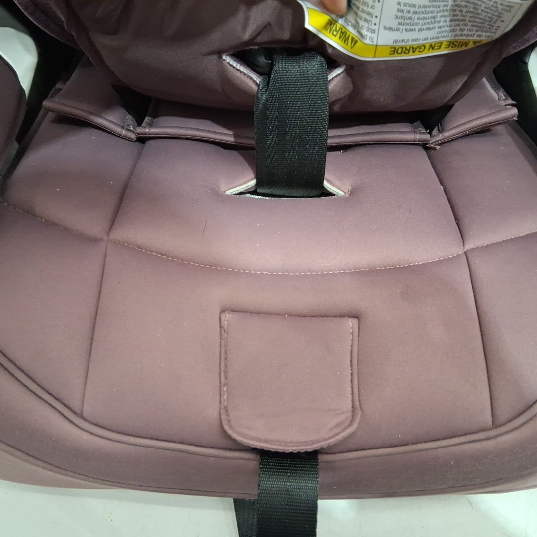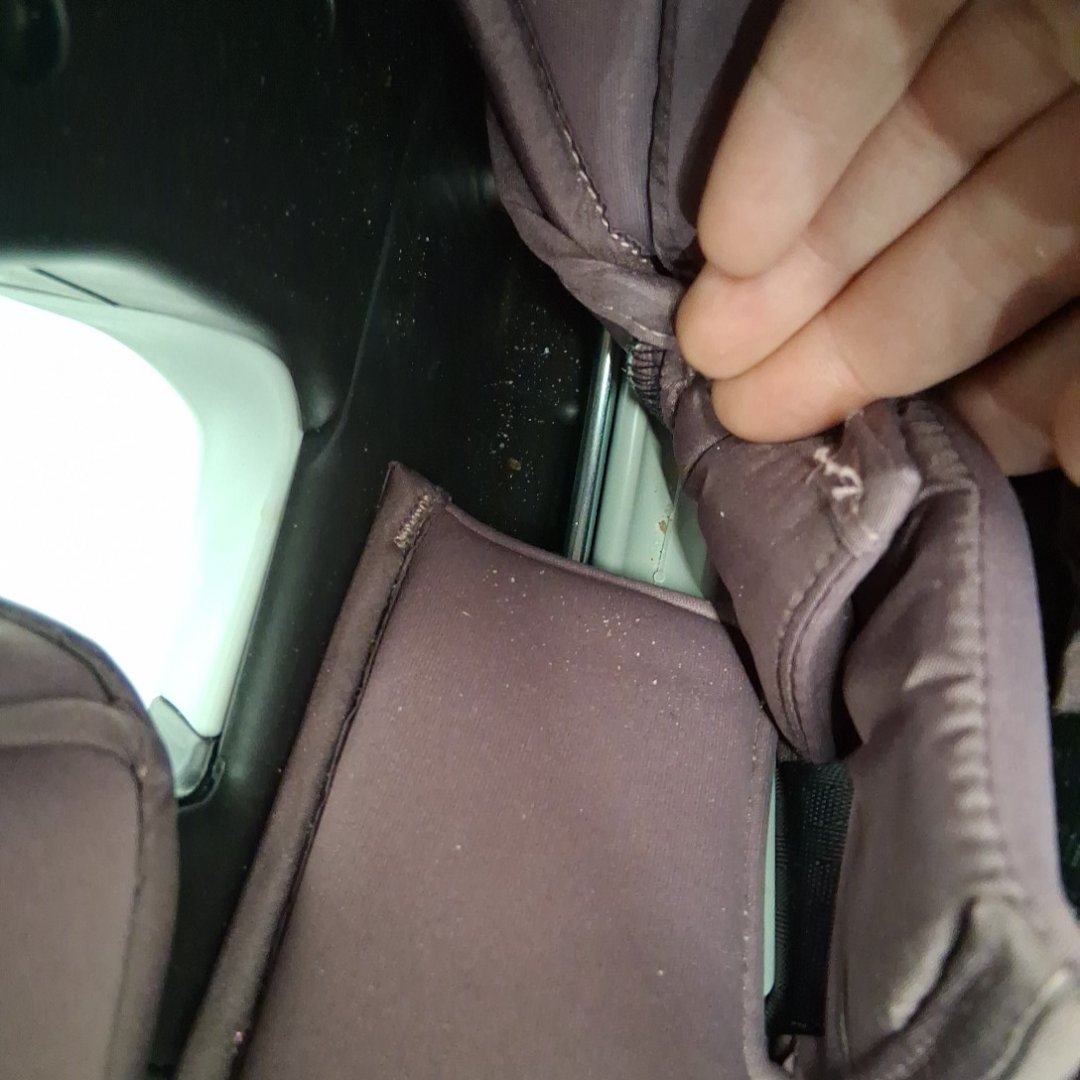 There are crumbs/debris on and under the seat. There is some discolouration in spots. There is also a small tear (about 1/2") in the fabric on the back near the top. (see photos)