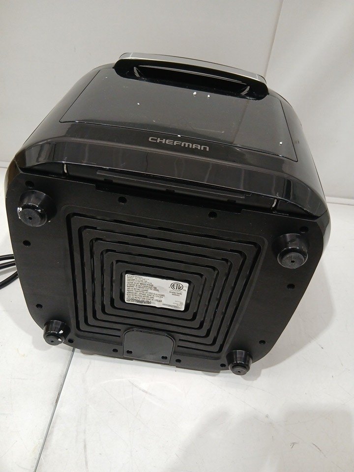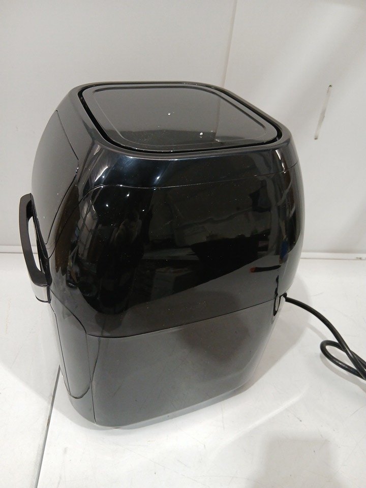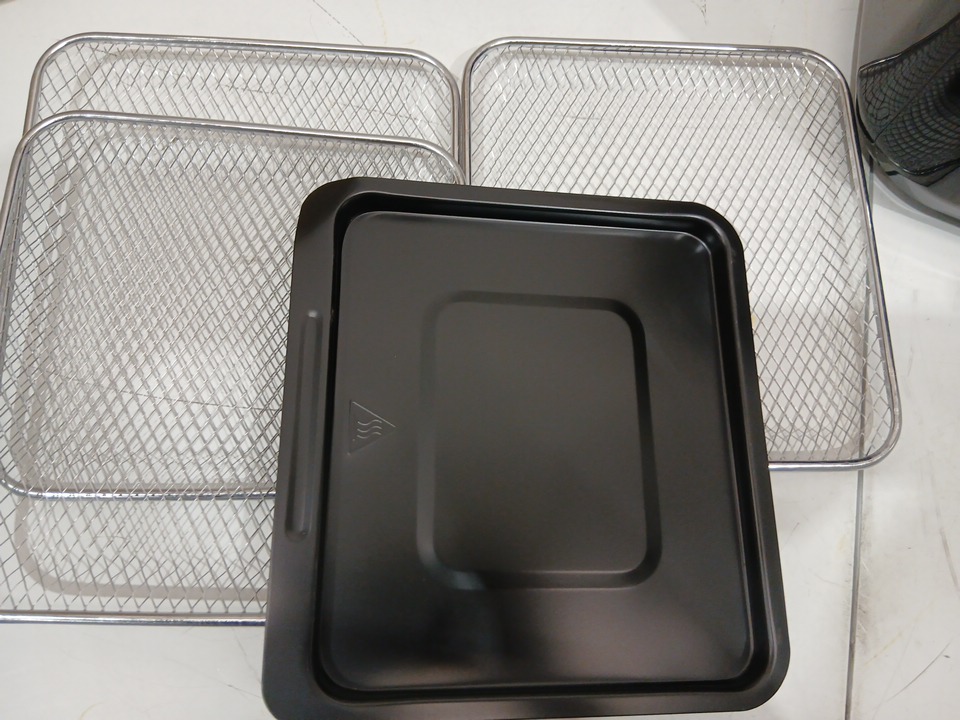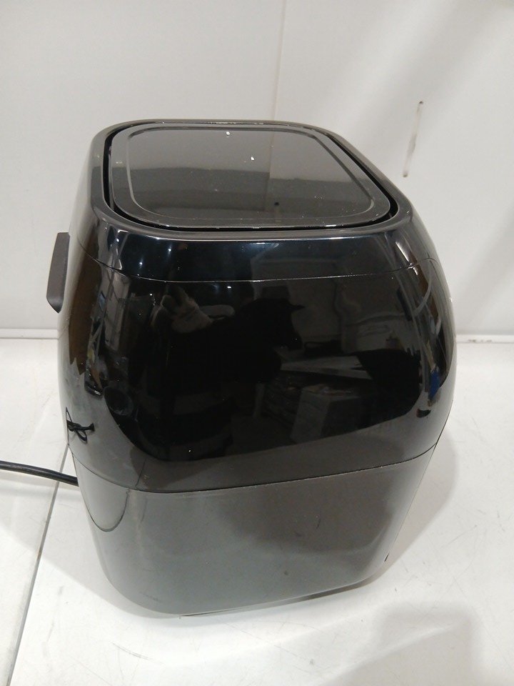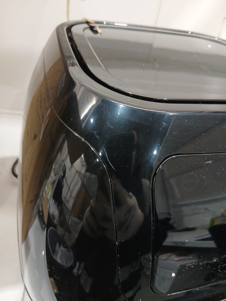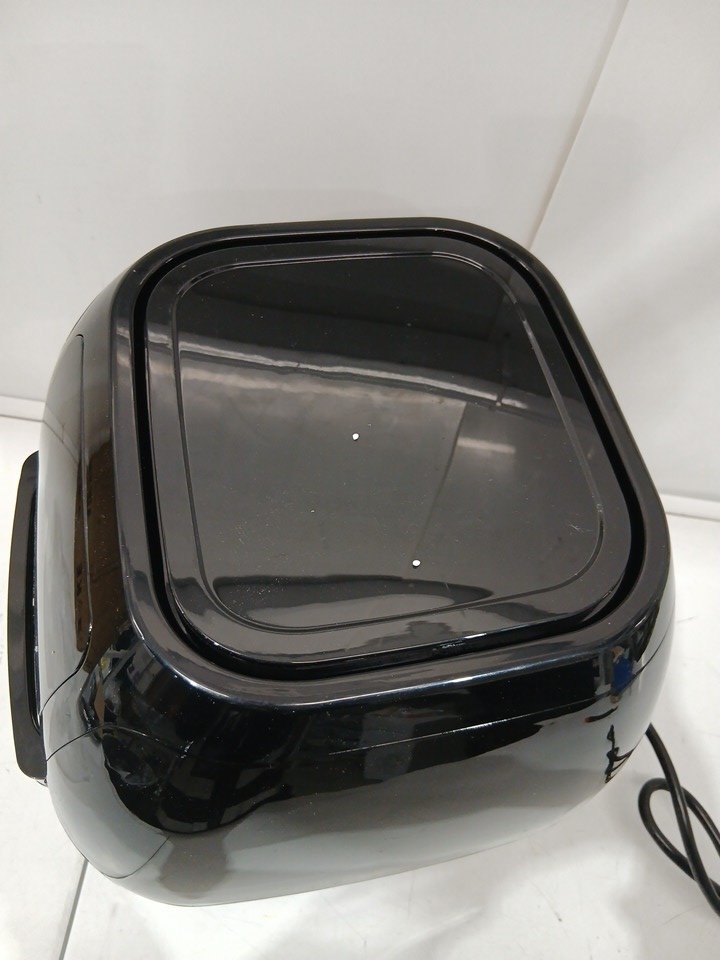 item appears new but has some minor dirt, fingerprints and scratches on outside of air fryer. tested and working for basic power.